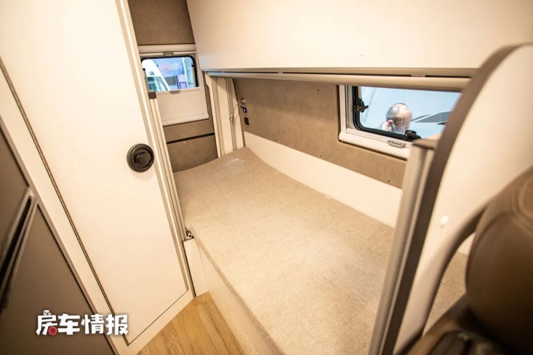 全车的休息区是采用了纵置的上下床设计方式,两张单人床的尺寸均为1950mm*900mm,平时也可以将上层的床铺折叠,为下部的床铺提供更多的空间。