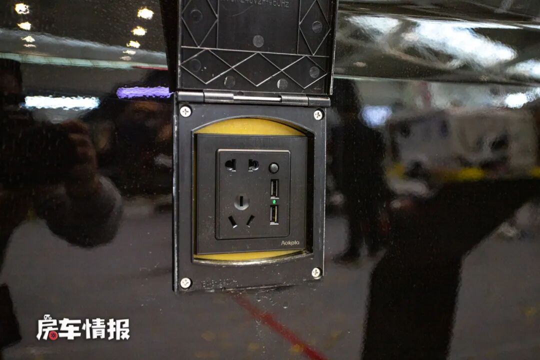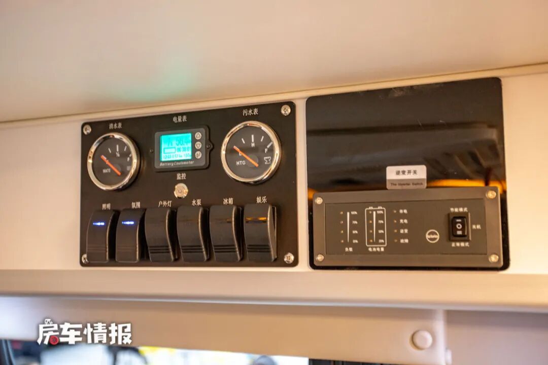 最后看一下全车的水电,电路上,这款房车搭载了一台3000W的逆变器,提供400Ah的铅酸电池,水路上则提供150L的净水箱和50L的污水箱,也能够满足平时的用水用电需求。