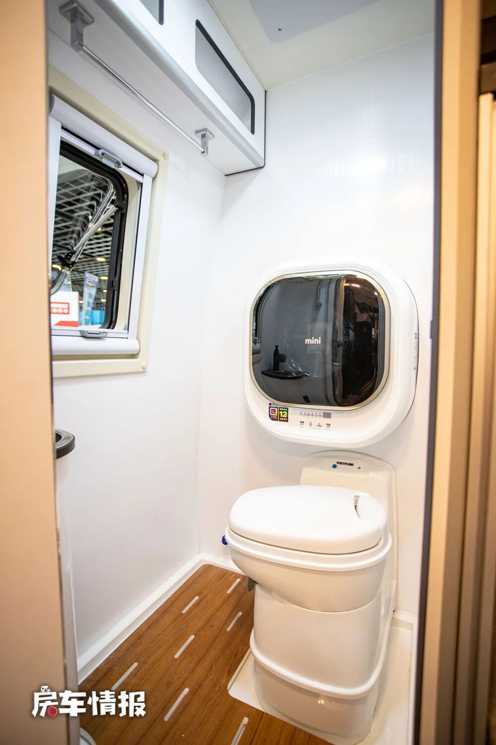 床铺旁边是一间单独的卫浴室,内部提供了洗手台、换气扇、淋浴花洒、梳妆镜、马桶和mini洗衣机,但是洗衣机和马桶的位置比较尴尬,不过好在可以满足平时出行的洗漱需求。