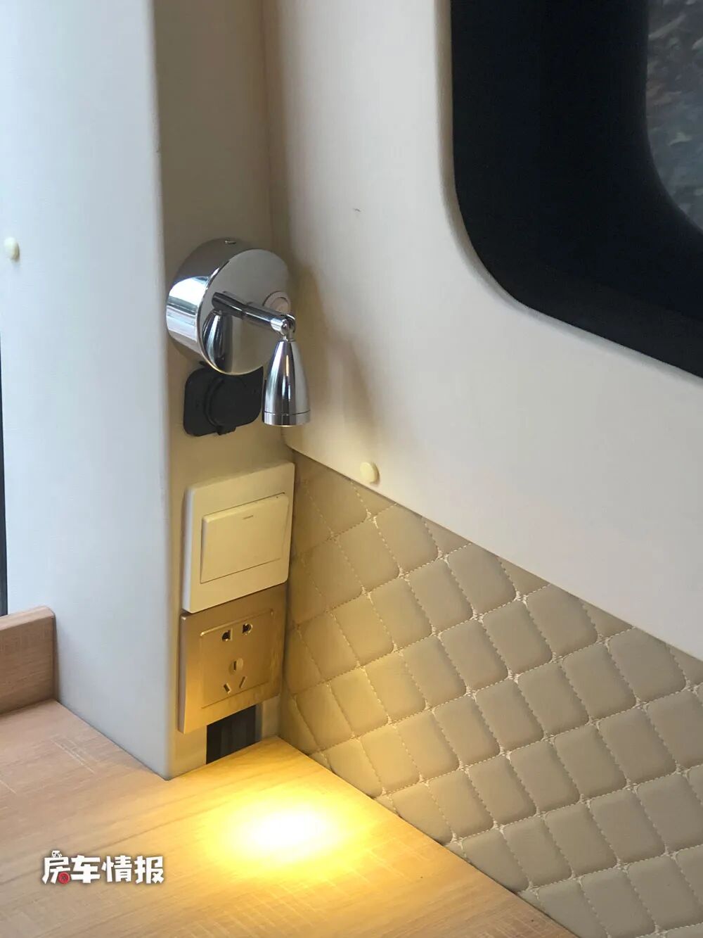 车厢尾部是整车的休息区,提供了一张双人床,平时可以容纳两个成年人休息使用。床头的上方不仅提供了阅读灯,还提供了两个储物吊柜,平时可以存放一些衣物,拿取也比较方便。