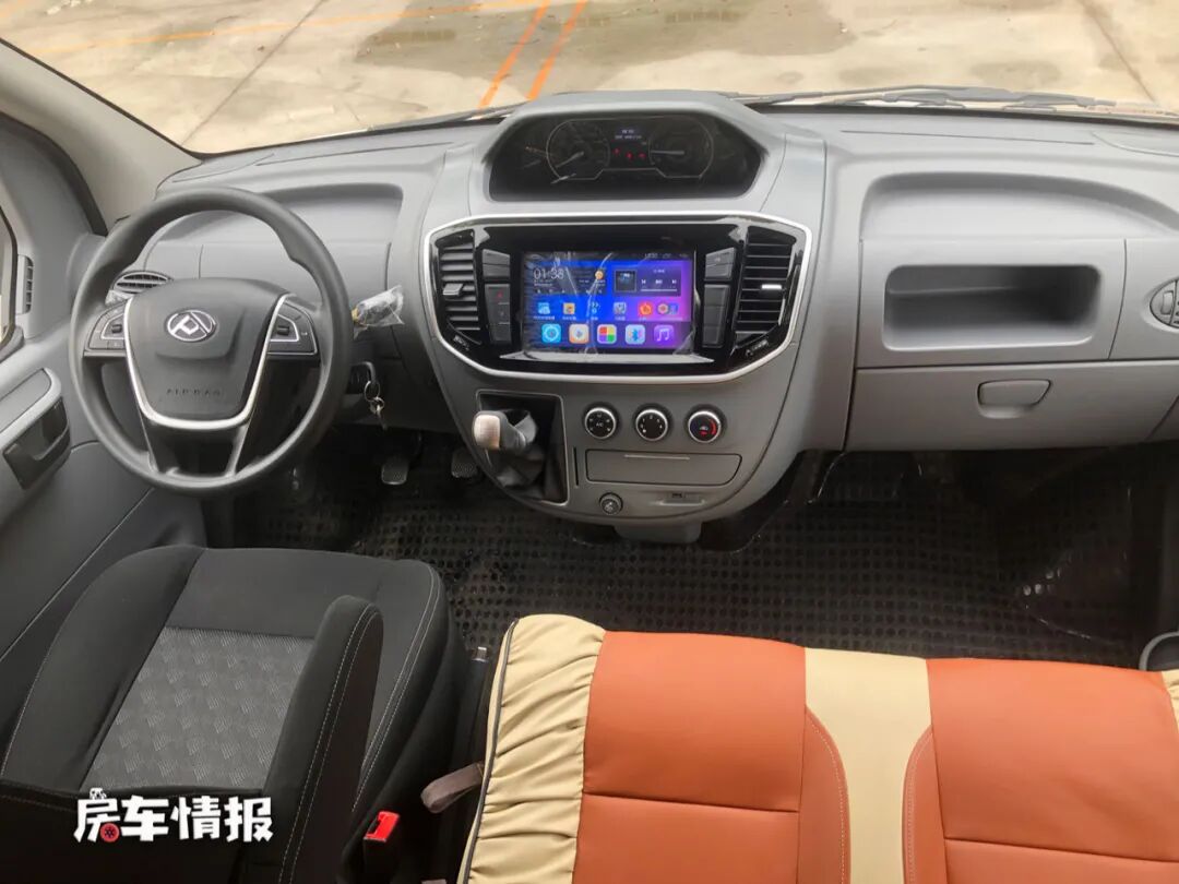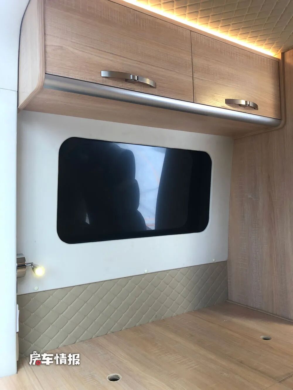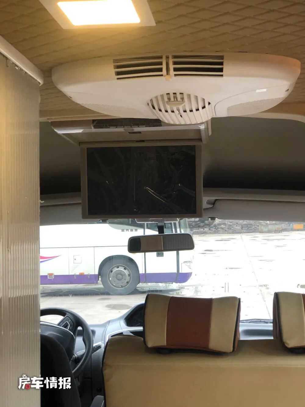在驾驶室的上方还提供了一台可折叠的液晶电视,平时驻车时也可以在车上看看电视,打发时间。