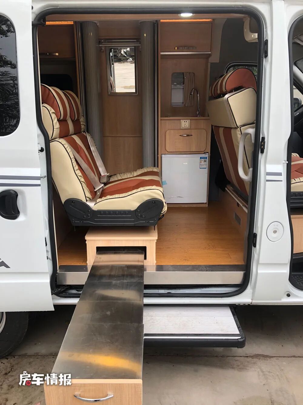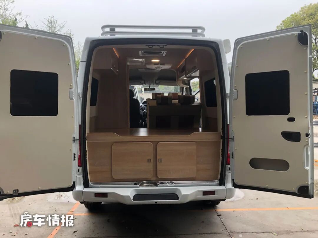 这款房车的尾门是可以180度打开的,打开之后可以看见暗藏在床板下方的储物舱,放些小件行李也是够用的。