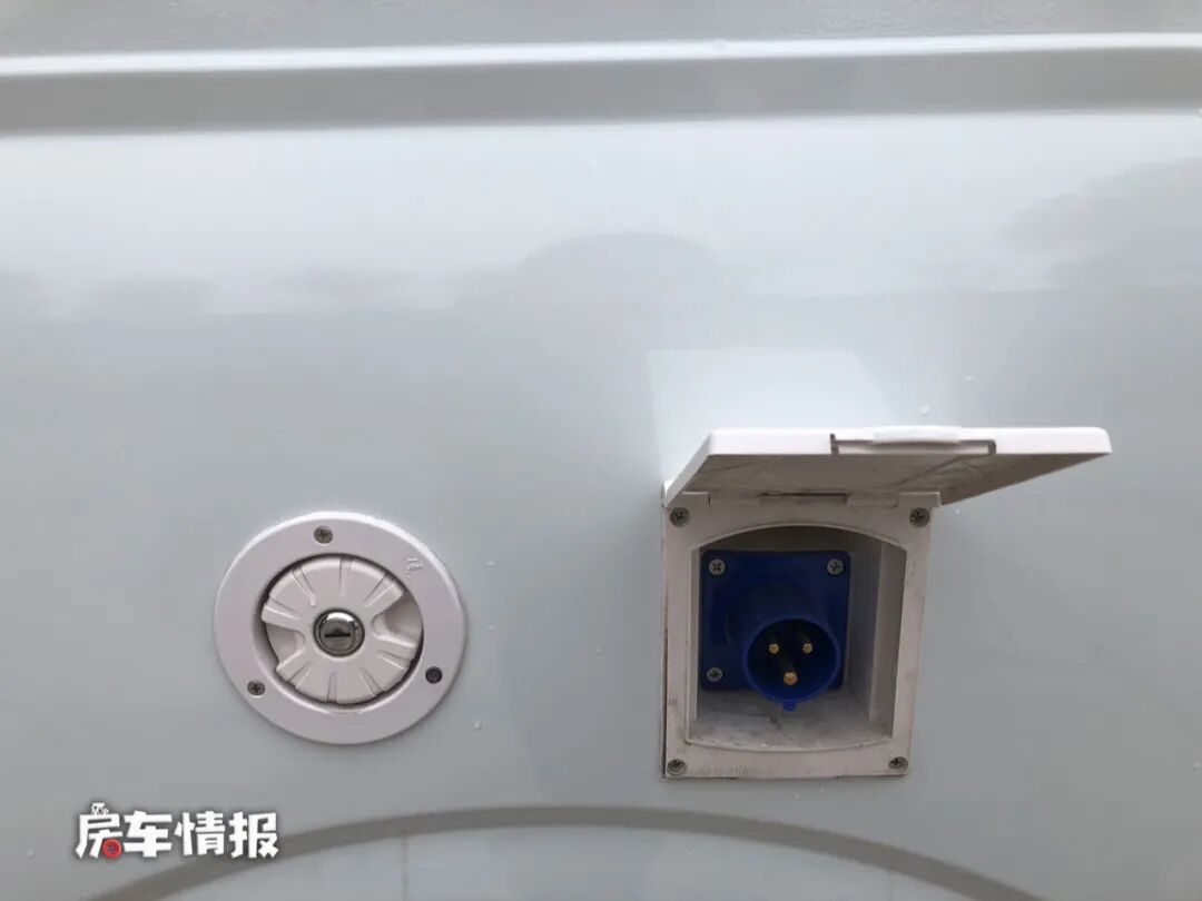 车身左侧提供了市电接口和注水口,方便平时给车辆补给。