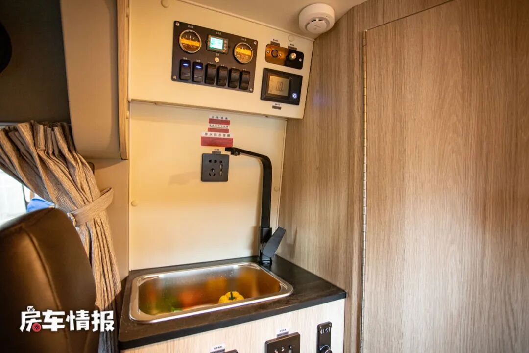 副驾驶座椅后方提供了一个小型的不锈钢水槽,平时洗洗瓜果蔬菜还是很方便的。下方则提供了一台71L的冰箱,存放一些零食饮料还是够用的。