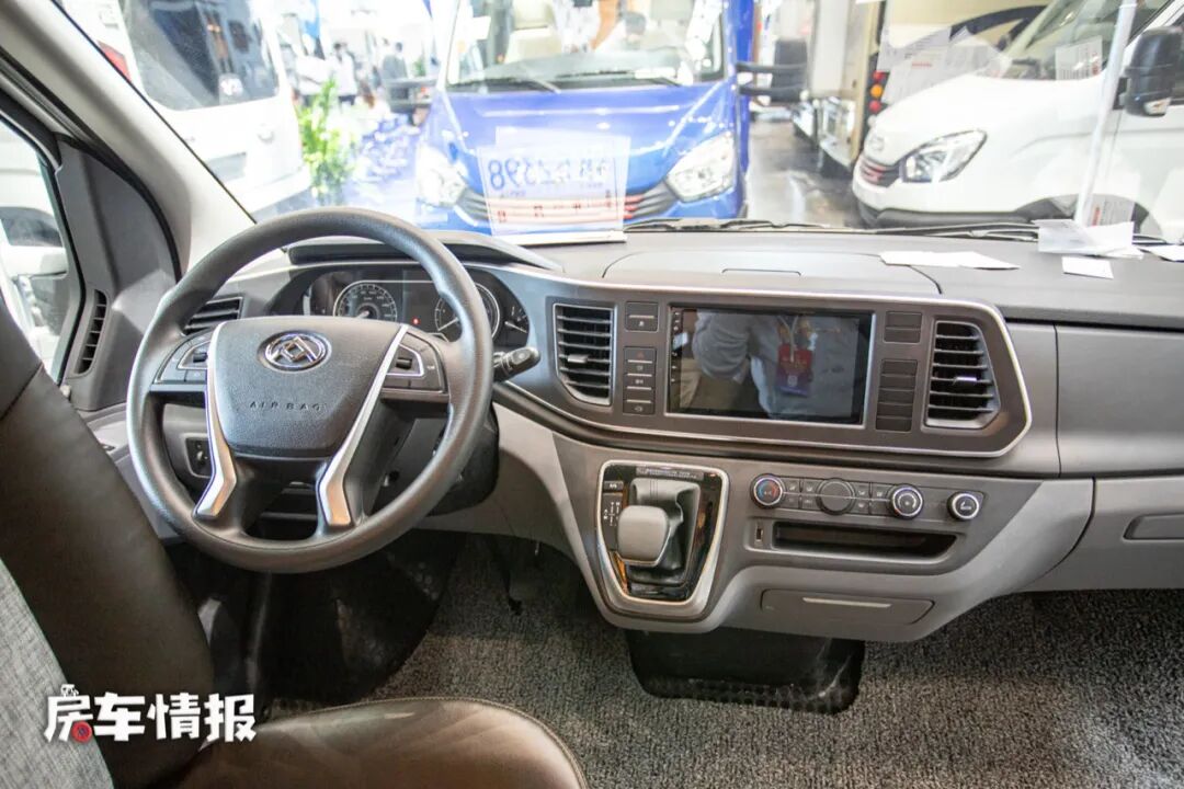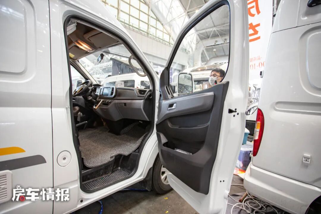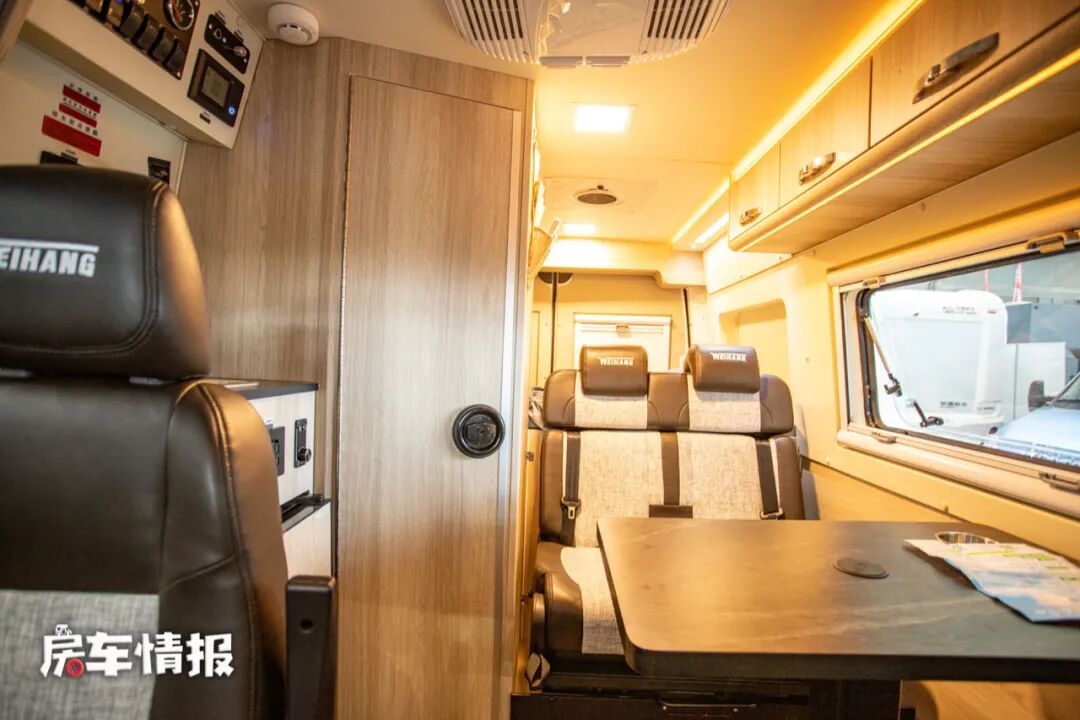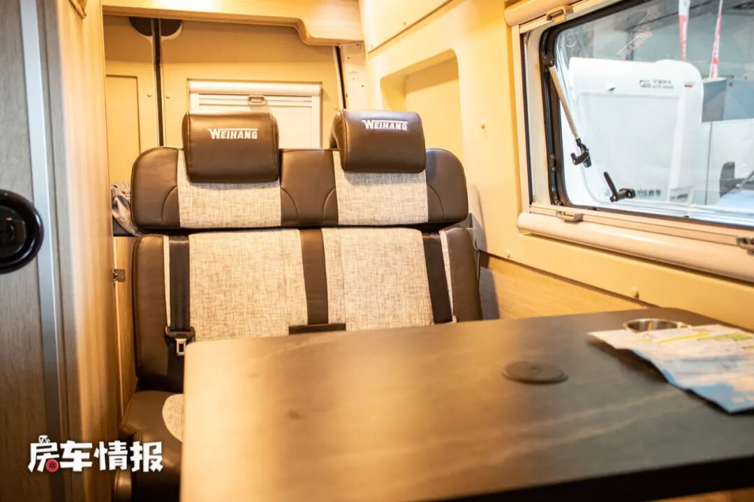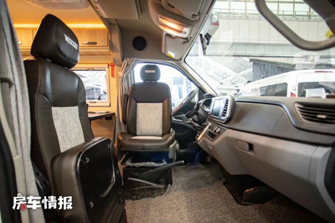 这款房车采用了无中门的设计,只能从左右驾驶室进入车厢内部,为此副驾驶采用了可折叠座椅,方便人员进入。