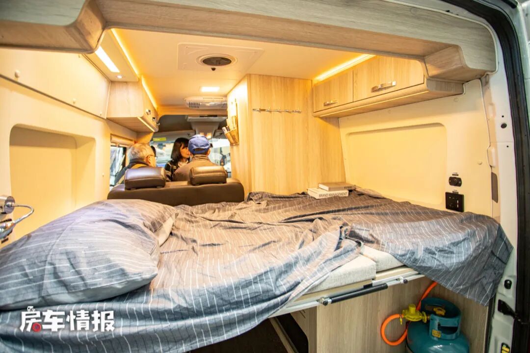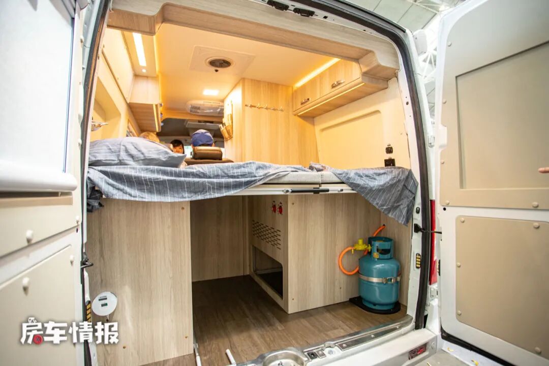 副驾驶提供了纱窗,防止平时进出放入蚊虫,从副驾驶进入车厢后部,虽然布局相较来说有些紧凑,但是整体的风格还是非常的温馨的。不过车厢内部的高度有限,所以比较高挑的人可能无法站直。