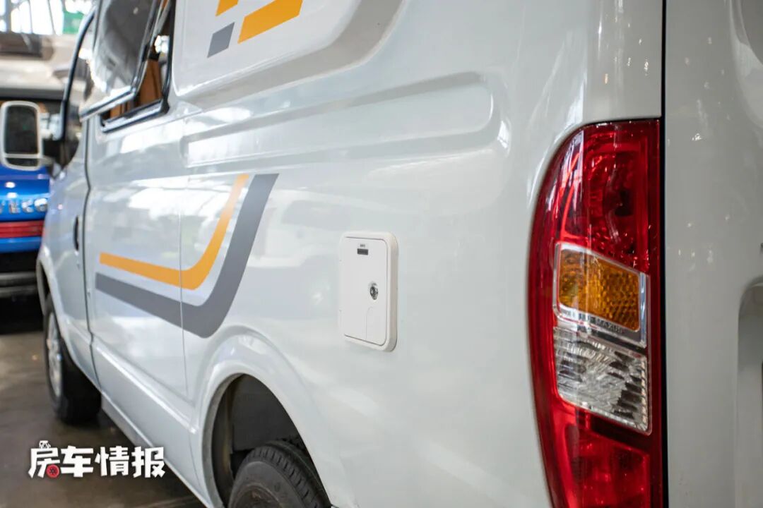 全车外观也采用了较为主流的设计,白色搭配橙灰拉花,简约时尚。车身外部配置了遮阳棚和水电接驳口,方便在车外驻足休息的同时也可以随时为房车进行补给,另外还配备了燃气外接口,可以外接燃气灶,在车外生火做饭。
