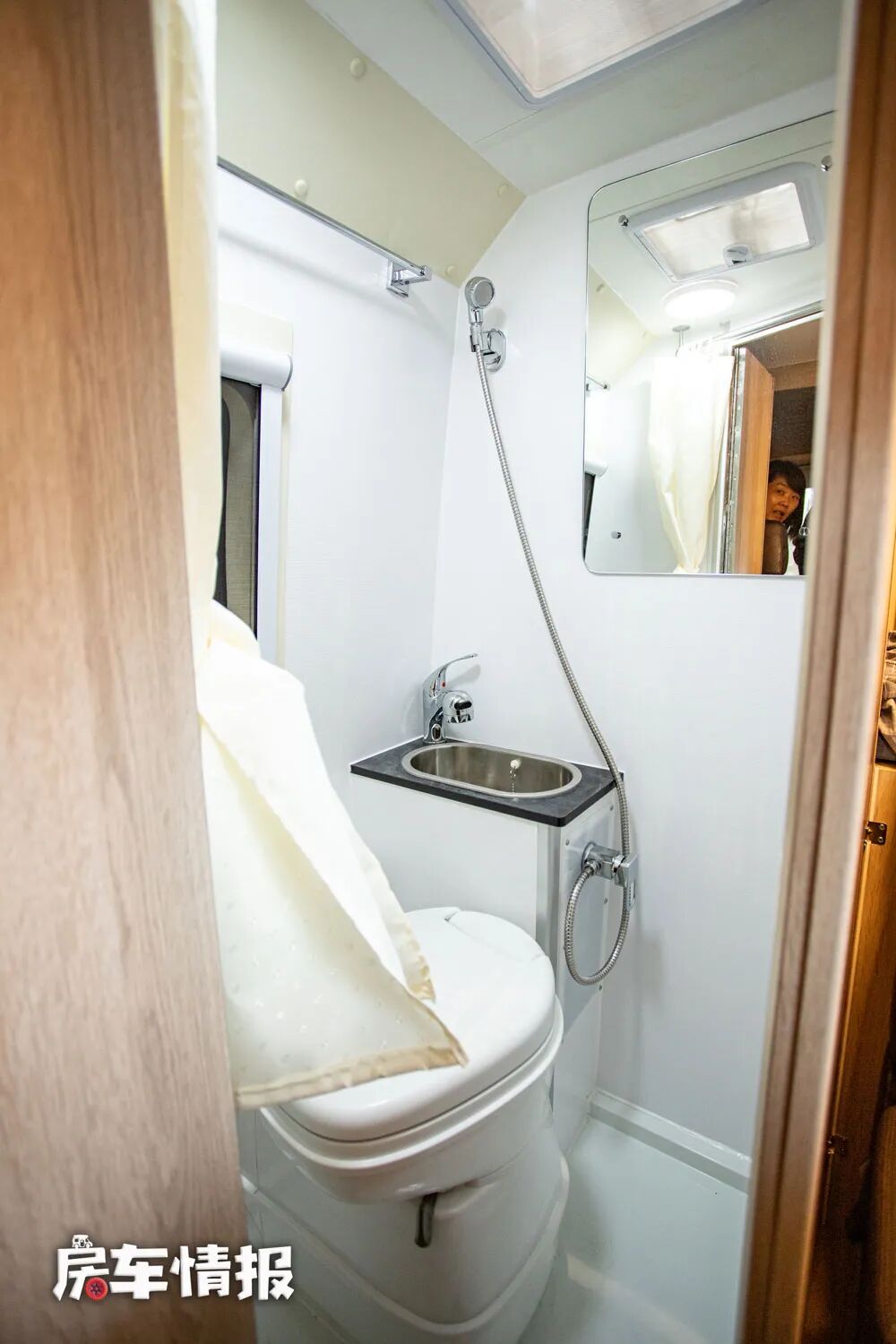 后方是一间独立的卫浴室,内部提供了旋转马桶、洗手台、淋浴花洒、梳妆镜和换气扇等洗漱设施,洗澡上厕所还是没有问题的,马桶后期也可以换成便携式的,只不过卫浴室内部空间有些低矮,平时洗澡的时候要坐着洗,这点或多或少还是不太方便的。