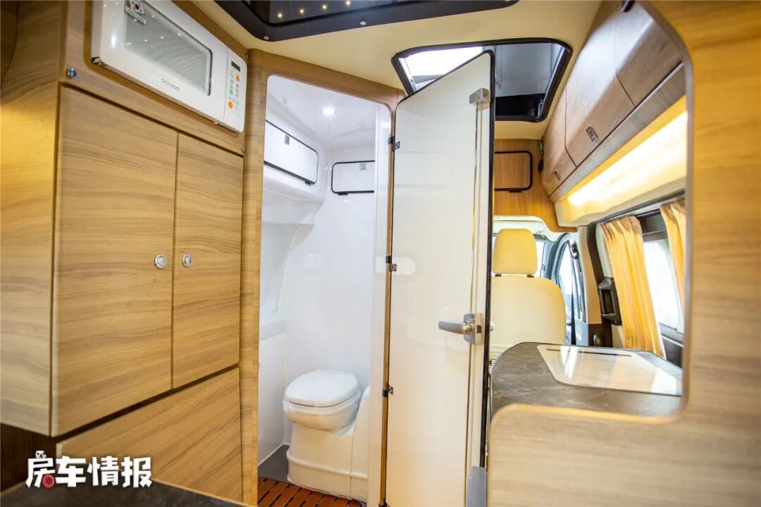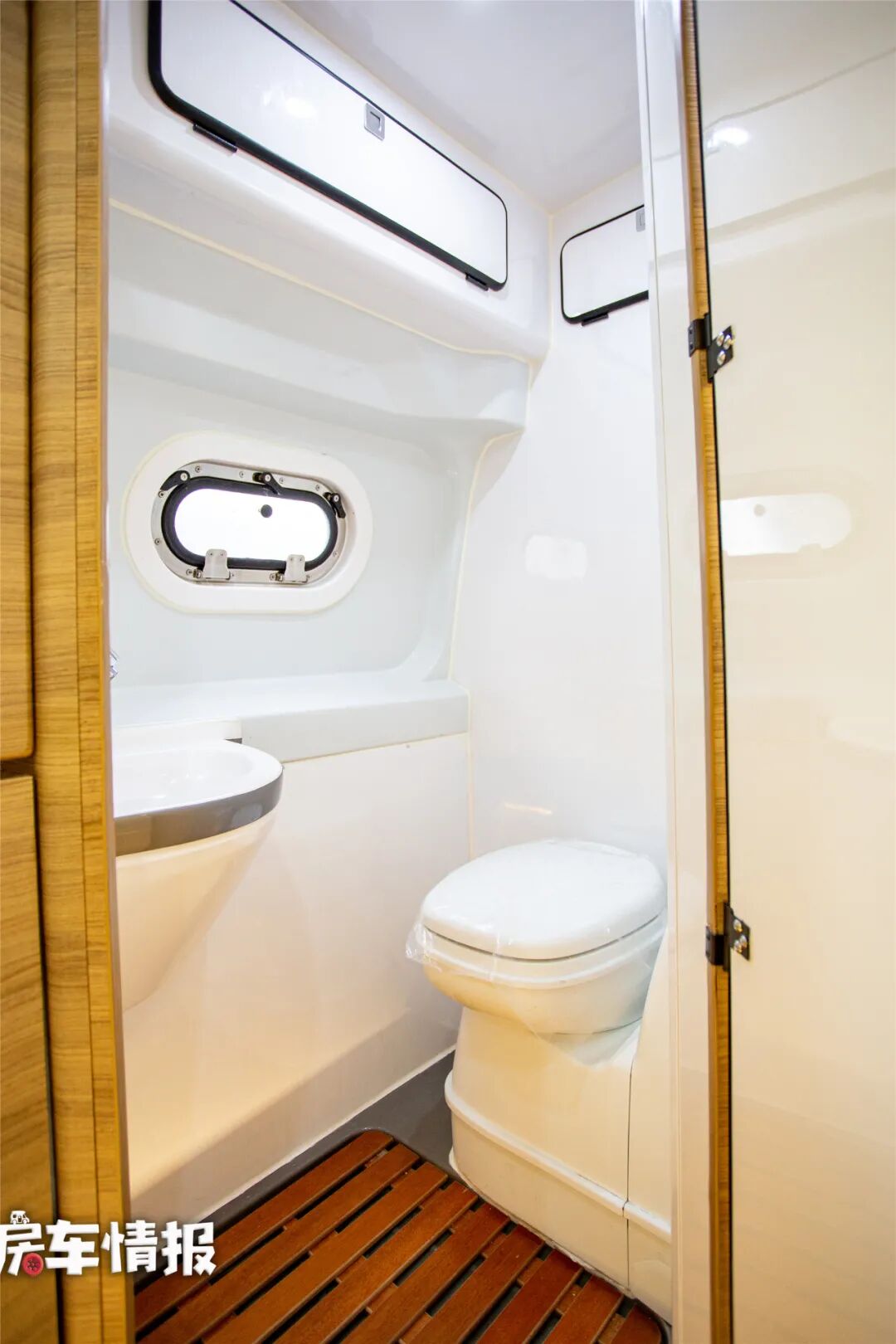 在这个空间不是很大的车厢里还出人意料地提供了一个空间挺大的卫生间,卫生间内部空间比起其它品牌的同底盘房车要明显大了不少,基本上已经赶上了一些大通、依维柯B型房车的水准。