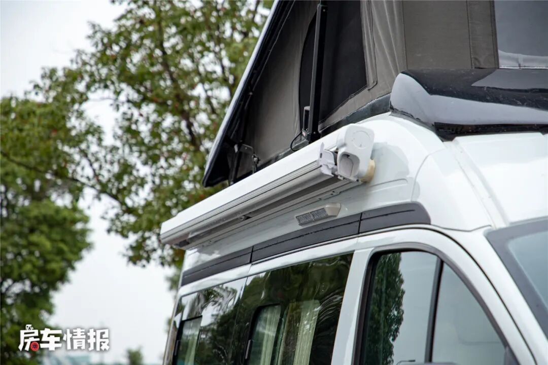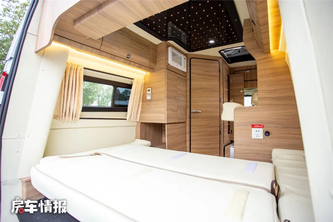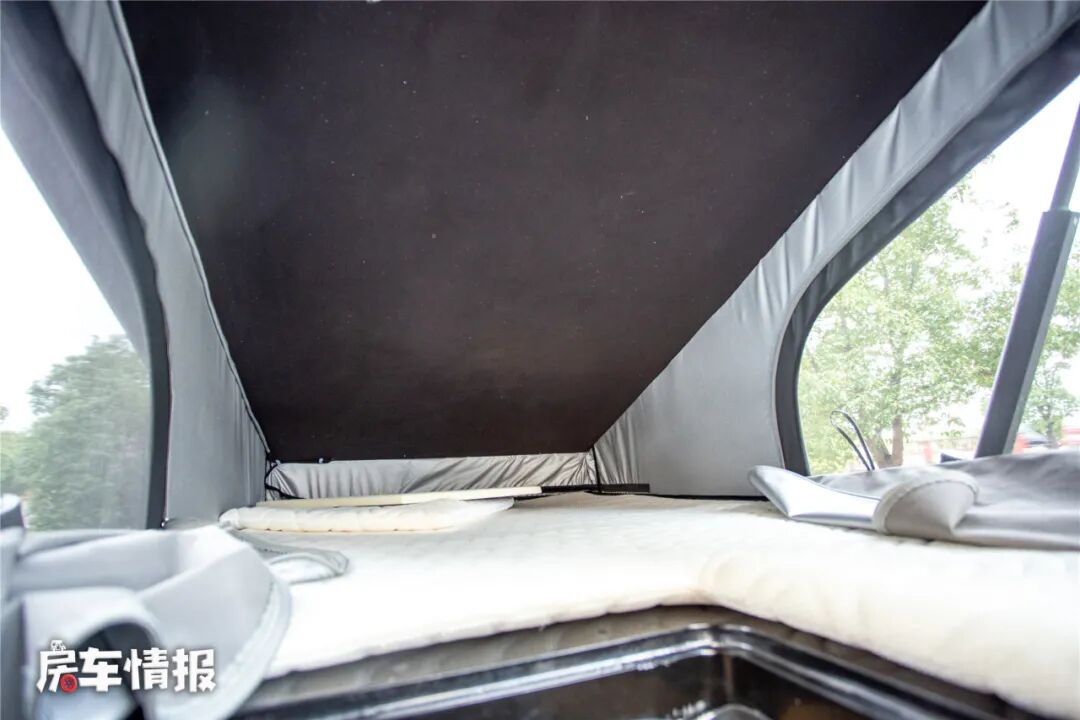 由于这款车顶部采用了一个电动升顶设计,在车顶还提供了一张尺寸达到了2000*1300mm的双人床,这样的话车内就可以满足一家4口人居住了。
