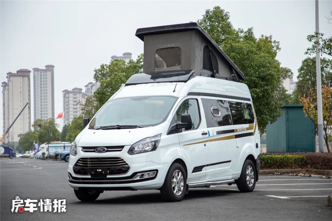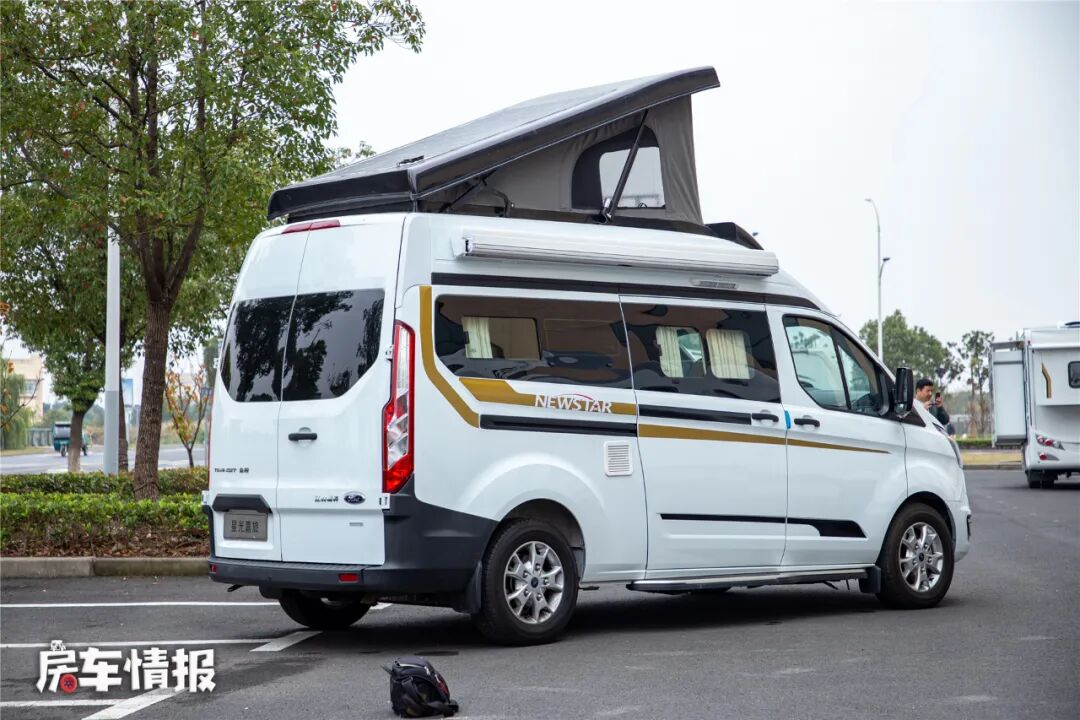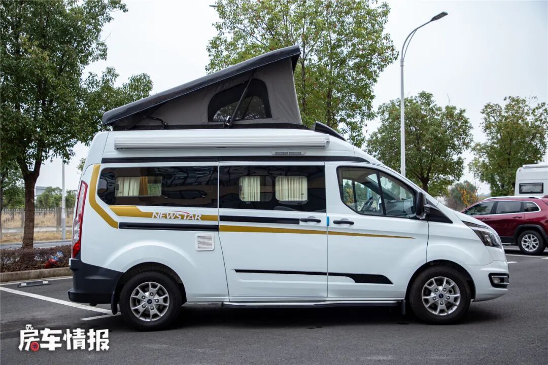 这款房车基于福特新全顺底盘打造而成,整体造型依然是保持了普通版车型的设计风格,不过在车身内细节上还是能够看出一些端倪,让人知道这是一款房车。例如车身左侧的遮阳棚、彰显个性的车身拉花、更加私密的车窗等等,但依然是比较低调。
