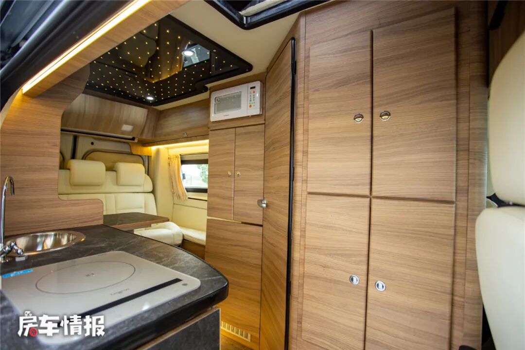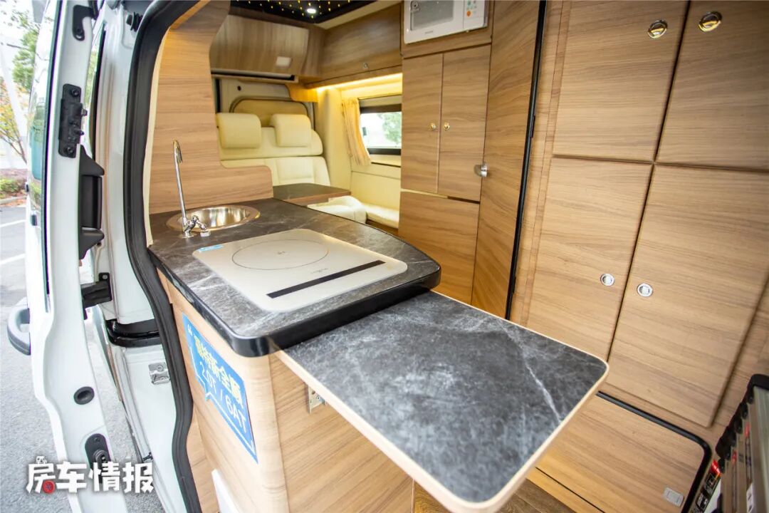 位于车门处是一组橱柜设备,这里提供电磁炉、洗菜池、微波炉以及一台容积80L的房车专用冰箱,能够轻松满足日常做饭的需求,如果不想把车内弄脏,还可以自备一套便携式卡炉。