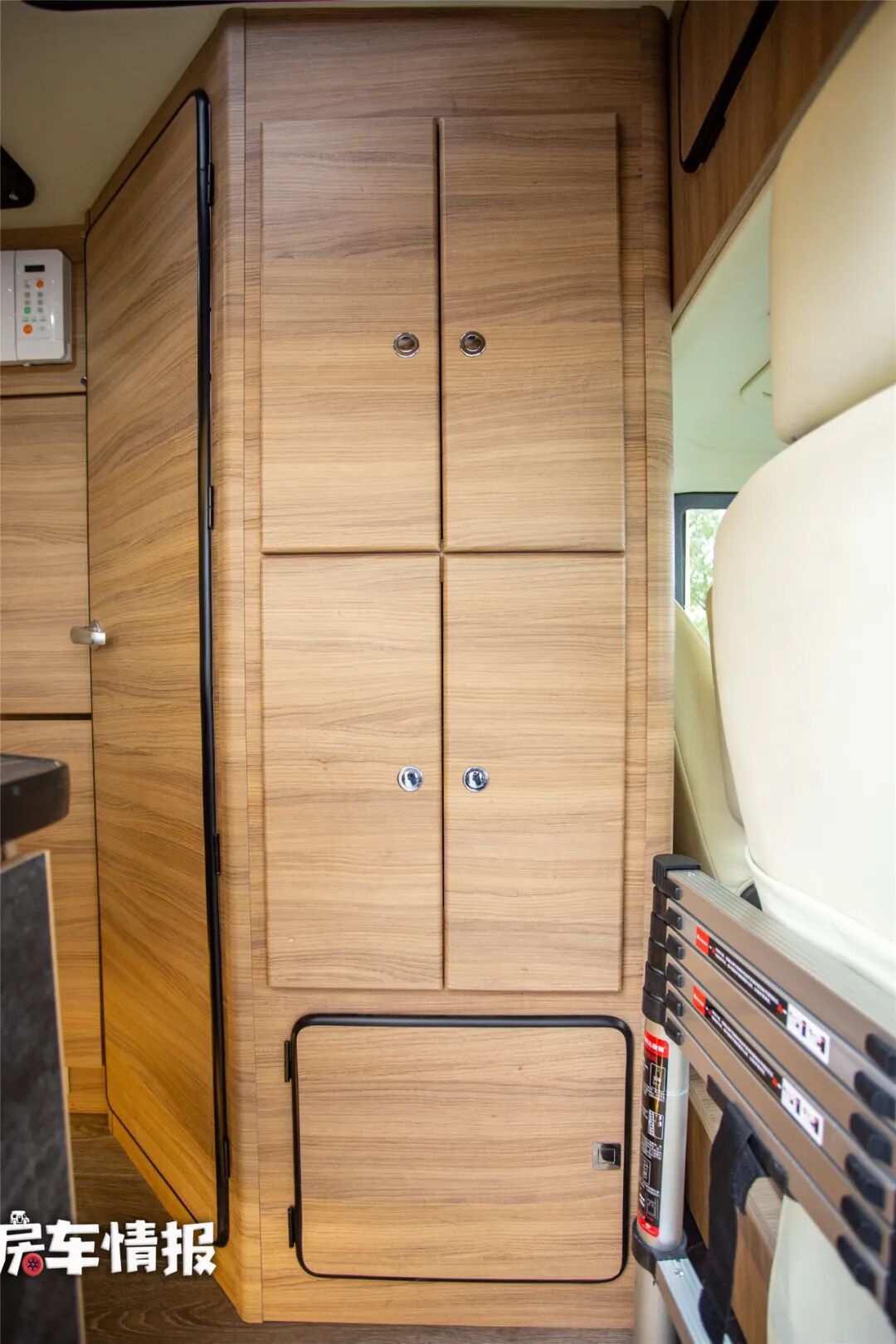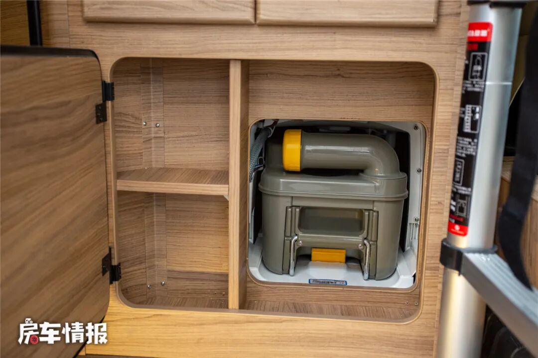 在卫生间外侧的墙壁上提供了一组储物柜,不过可惜的是受限于车内空间,储物柜的进深不是很大,只能放一些相对扁平的物品。比较有意思的是盒式马桶的黑水箱就位于柜子下方,日常拿取都比较方便。