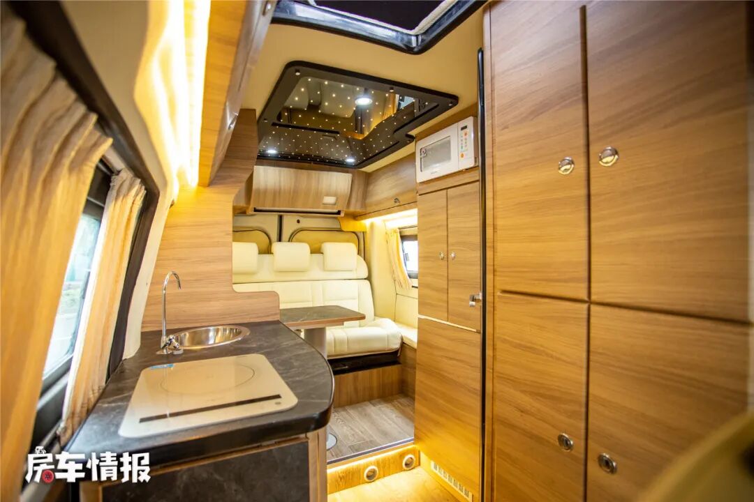 作为一款能够日常代步的房车,车身尺寸自然不能太大,这款车的长宽高分别为5400*2040*2480mm,长度基本上和一些D级行政轿车相当,城市内标准车位都能够停进去,而不到2米5的车身高度也能够满足部分地库进入。