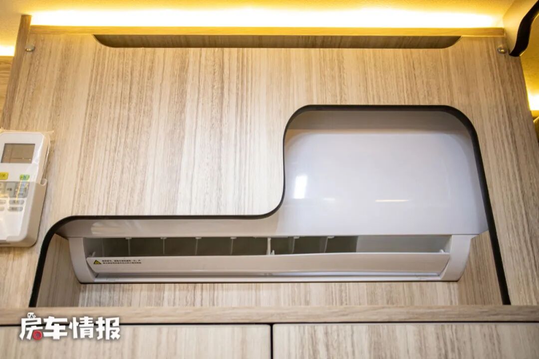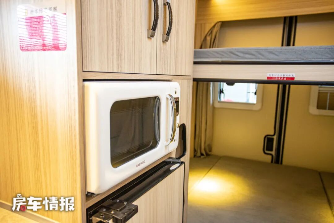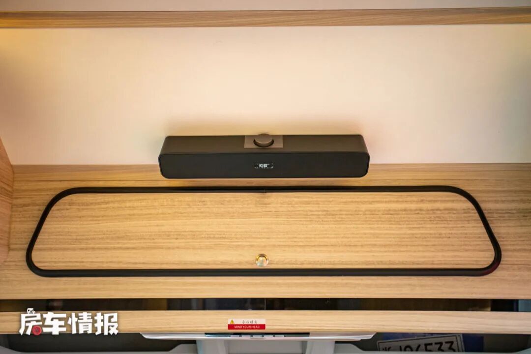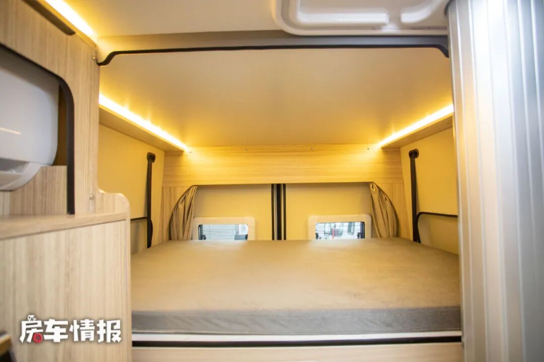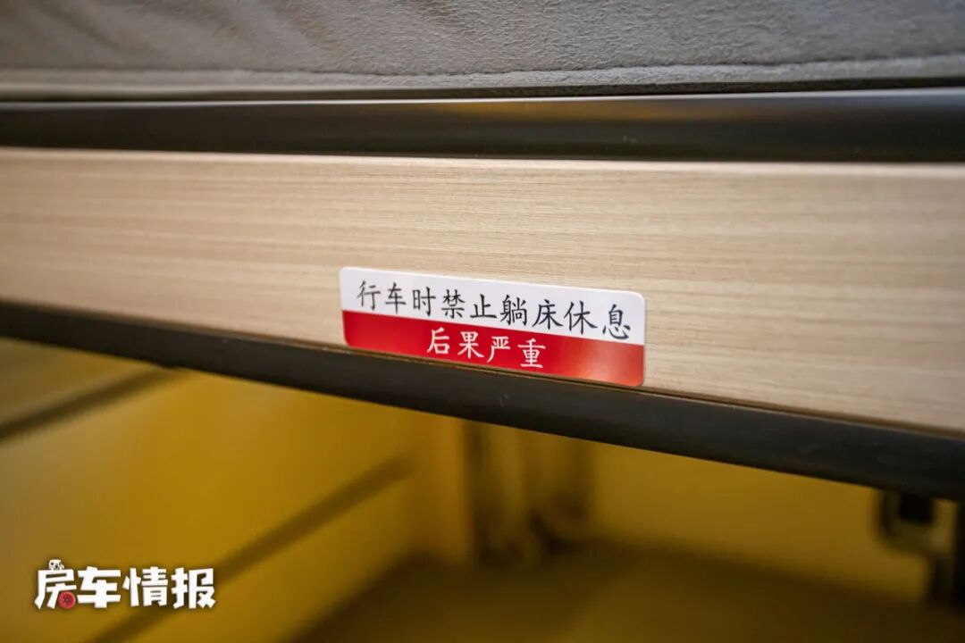 而上方的双人床也采用了电动模式,可以根据自身需求调节使用,不过无论是上床还是下床,在行车时都是不能坐人或者睡觉的,这点厂商也给了明确的提示,还是非常人性化的。