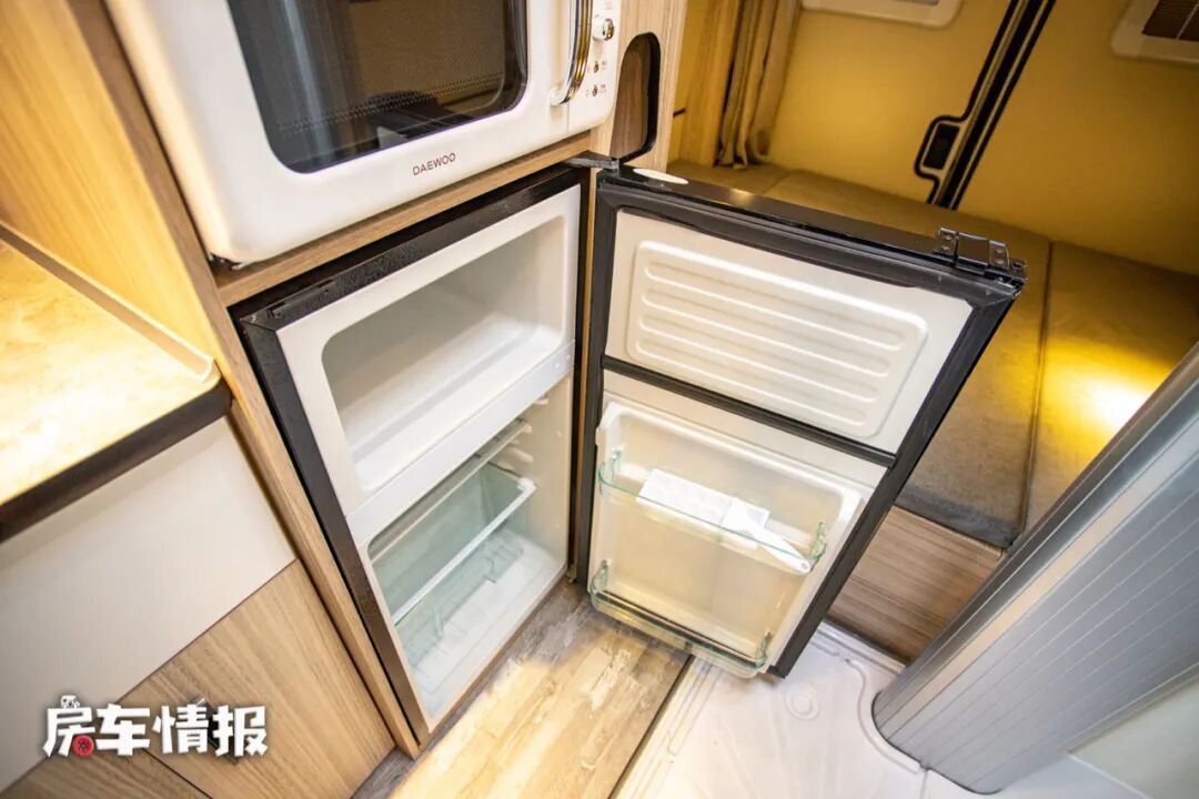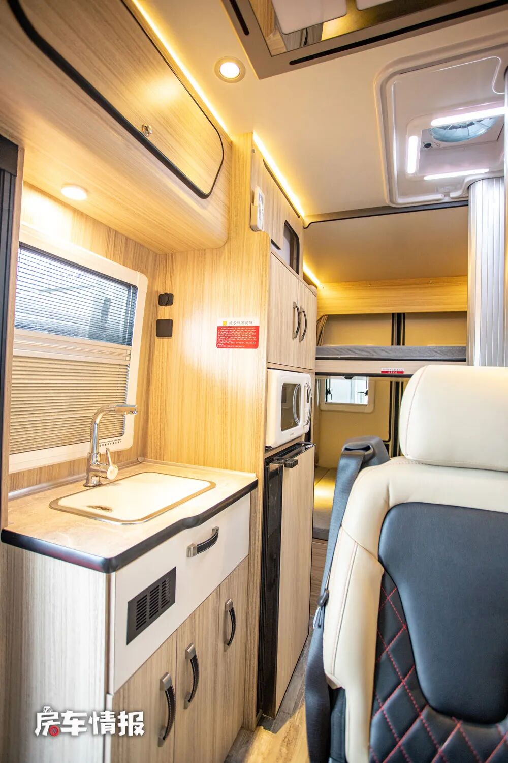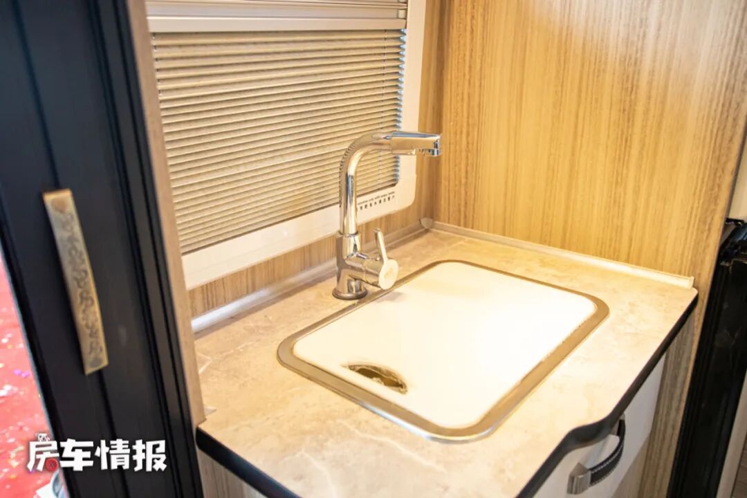 乘客门后方是厨房区,厨台的面积并不是很大,只提供了一个带盖的洗菜池,但是在橱柜外侧提供一个抽拉式燃气灶,上方还配备了置物架,方便平时做饭炒菜使用,而且也解决了在车内做饭会带来的油烟问题。橱柜的上下方也都提供了大尺寸的储物箱体,方便平时储物。
