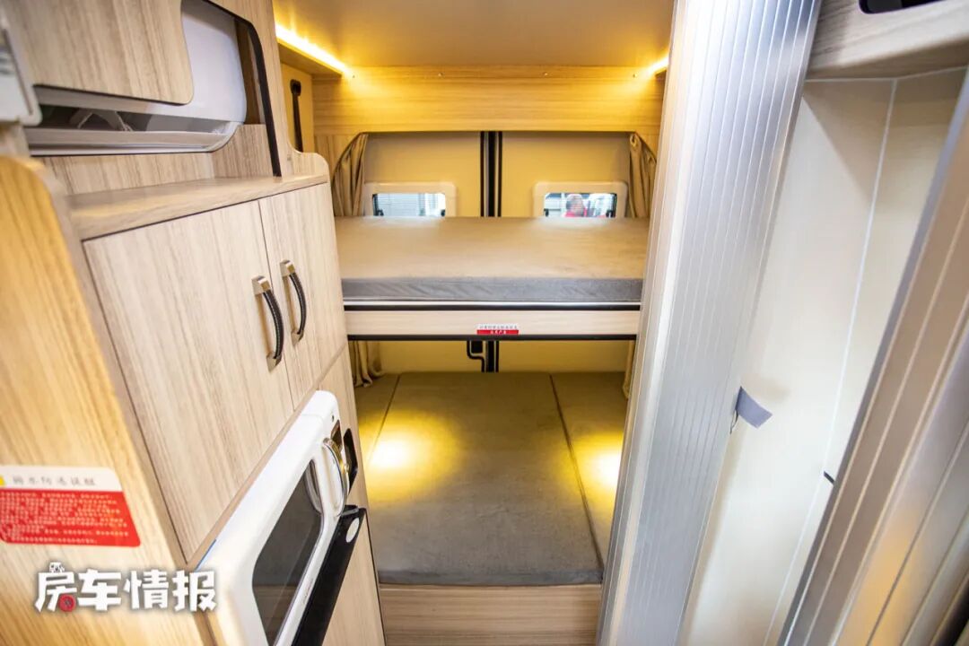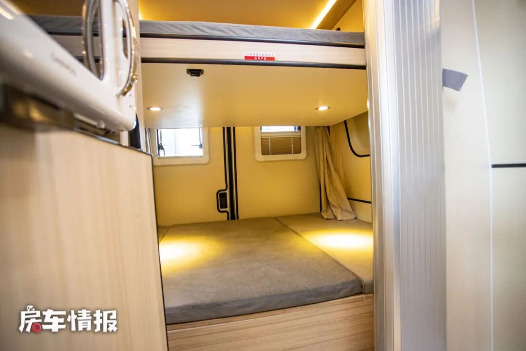 这款房车的亮点在于车厢尾部的休息区,提供了两张上下的双人床,但是与其他车型床铺设计方式有所不同,这款房车的下床离地距离非常小,为两张床中间预留出了更多的空间,也防止在起身中磕碰到头部。
