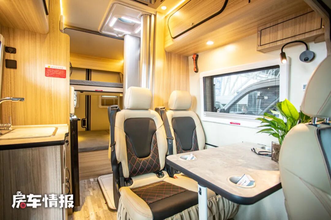 主驾驶座椅后方是会客区,由两个沙发座椅和一个可移动的小餐桌组成,座椅采用奔驰威霆座椅,提供了安全带和头枕,可以缓解行车途中乘坐的疲劳感。不过座椅距离餐桌的位置比较狭窄,身材高挑的人坐着可能会觉得压腿。另外在会客区的上方提供了一个储物吊柜,空间还不错,可以放一些零食饮料。