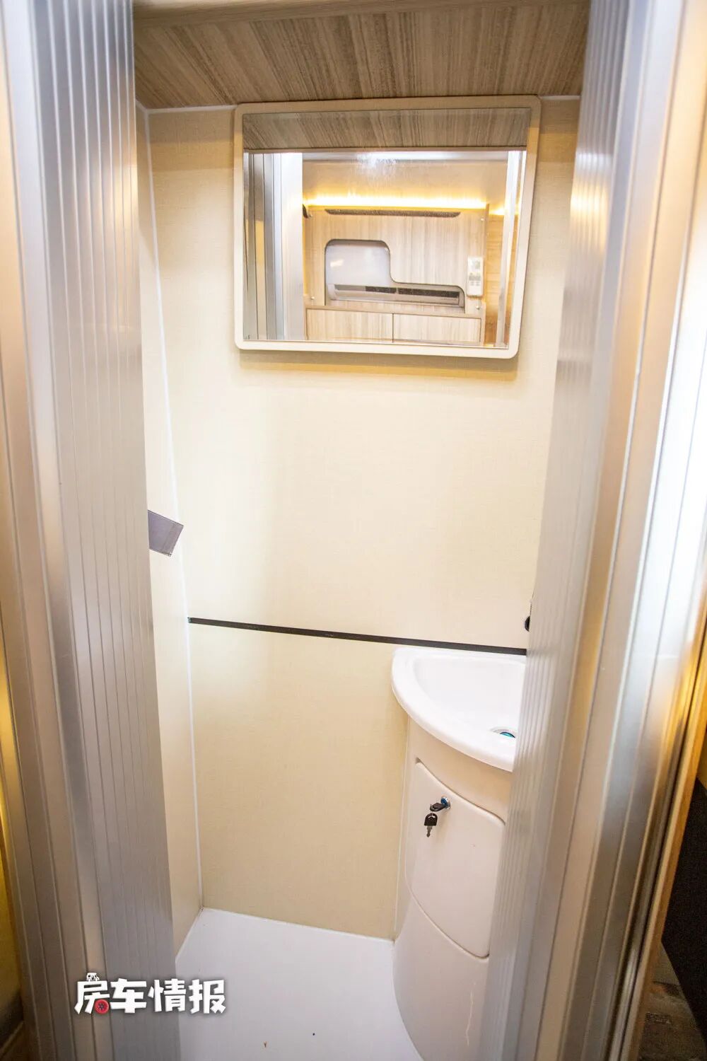 对面是一间半开放的淋浴间,平时不需要的时候为开放的方式,也不占用中间的过道区,需要使用的时候,就可以将卷帘门拉上,变成一间独立的卫浴室,内部配置了洗手台、梳妆镜和淋浴花洒,后期也可以加装一台便携马桶,基本还是可以满足出行的洗漱需求的。