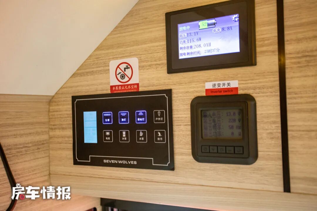 水电方面,这款房车搭载了一台3000W的逆变器,提供400Ah铁锂电池,并配备了200W的太阳能板,水路上则提供了150L的净水箱和60L的污水箱。