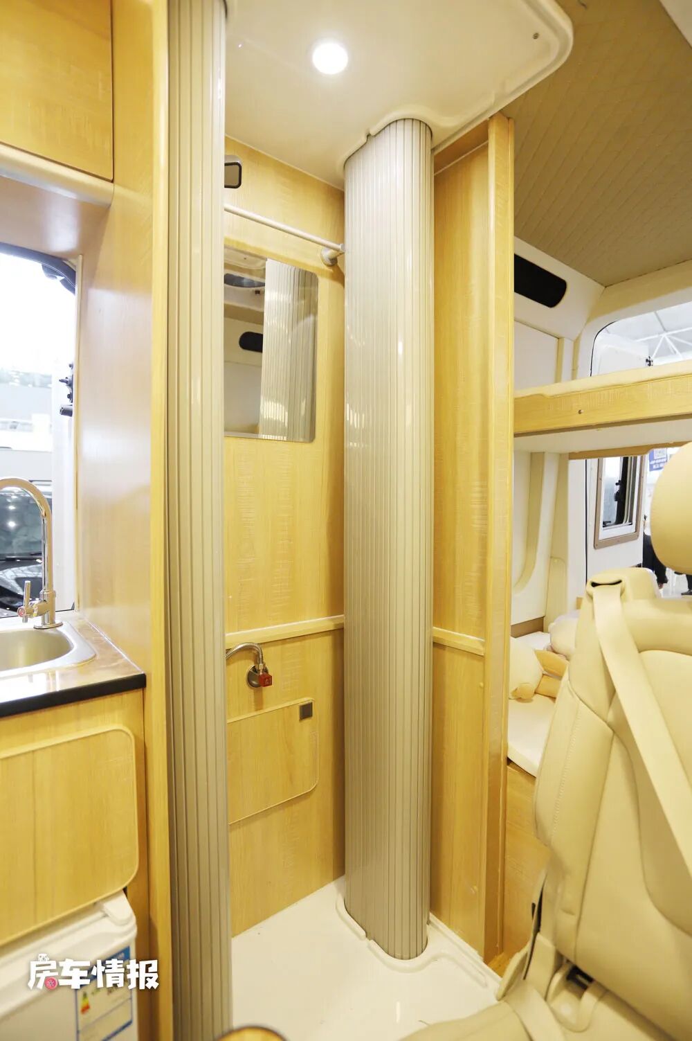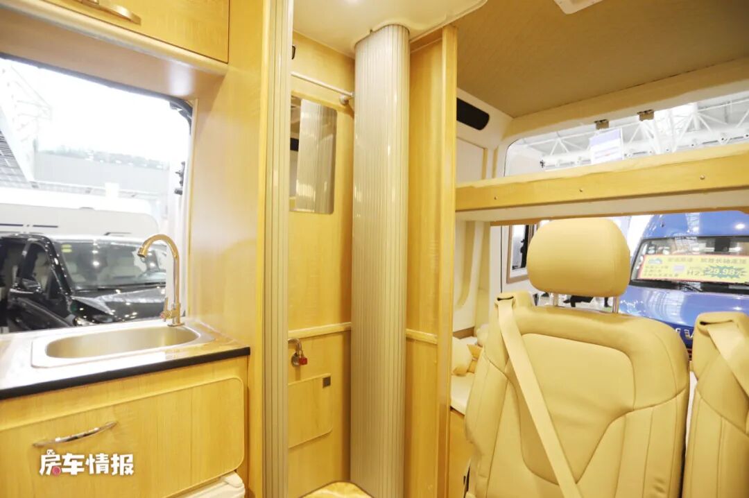 与以往我们所见的B型房车内部布局有一些不同的是,这款房车的淋浴间设置在了厨房的后侧,采用了B型房车最常用的推拉卷门设计,内部提供了淋浴花洒和梳妆镜,和L13车型一样,这款房车的标配是不包含马桶的,但是后期也可以根据自身需求选装一台抽拉式的马桶。
