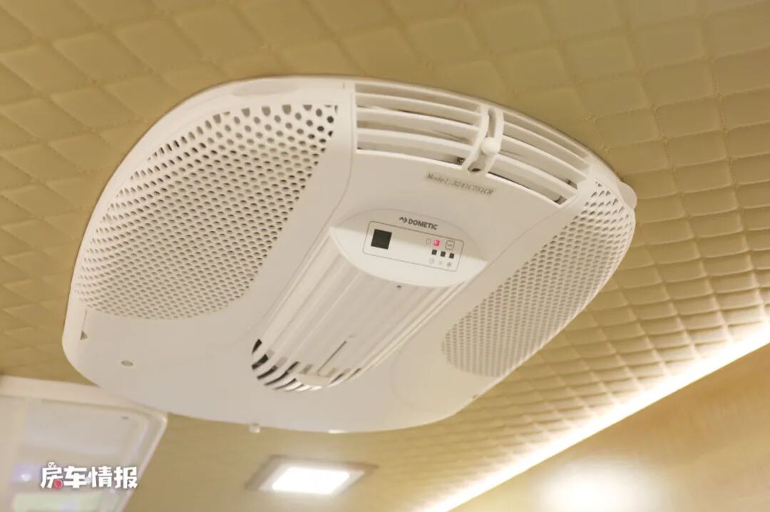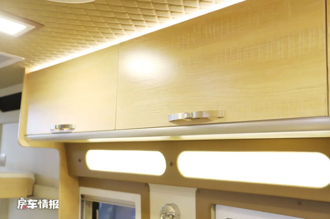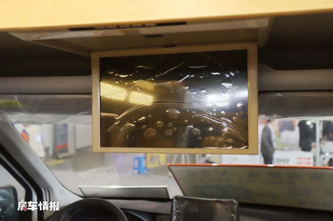 在驾驶室的上方,这款房车还配备了一台折叠的液晶电视,平时可以看看电视追追剧,满足娱乐所需。