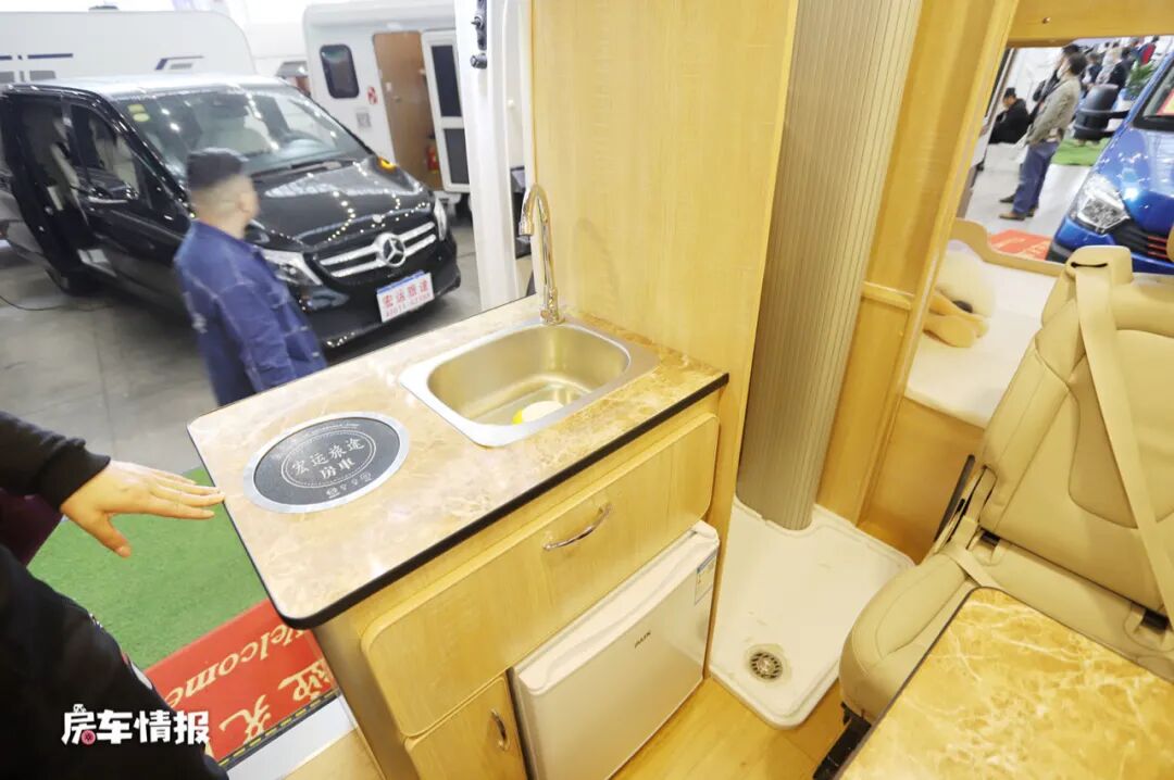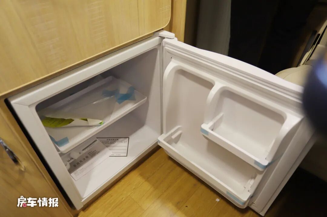 乘客门处的橱柜尺寸也不是很大,台面上提供了一台电磁炉和一个不锈钢的水槽,下方除了提供储物抽屉之外还镶嵌了一台50L的冰箱,虽然整体的空间不是很宽敞,但是好在配备基本齐全。橱柜侧面还提供了电源插座,可以外接厨用小电器。