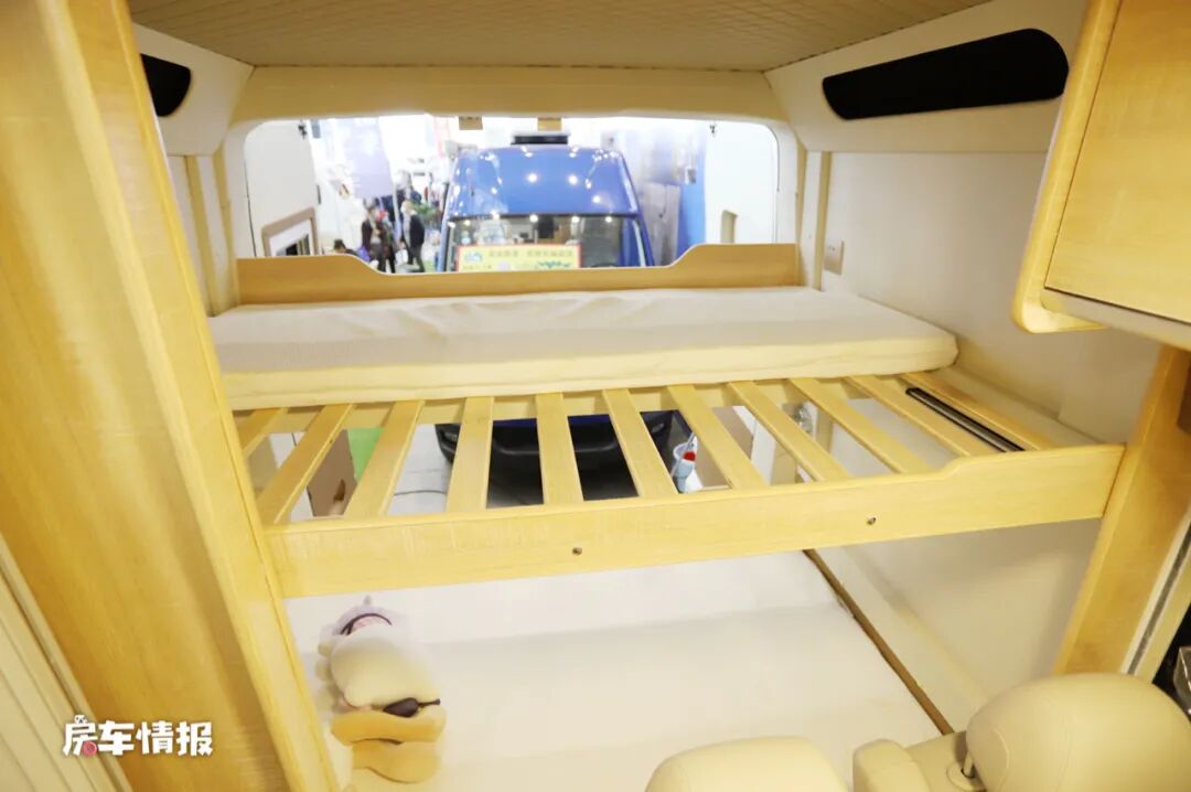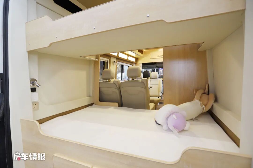 尾部的休息区采用了横着上下子母床的设计方式,平时形态为上单下双,可以为一家三口提供充足的休息区域,但是如果有需要,则可以打开上层单人床的拓展部分,变成一张双人床,这种设计更适合有两个孩子的家庭使用。另外床头也提供了充电插座和小夜灯,方便平时使用。