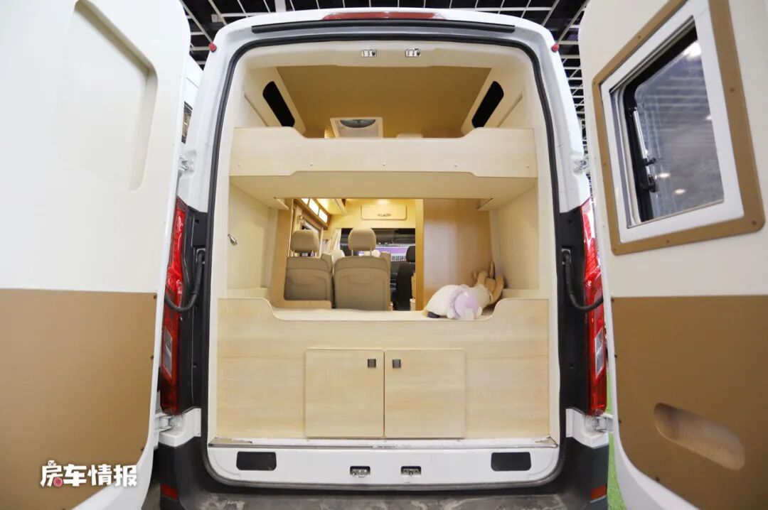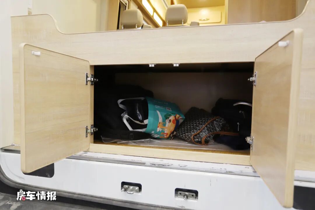 打开尾门,可以看到在下层双人床的下面还有一个大尺寸的双开门储物舱,平时可以放大件的行李,空间还不错。