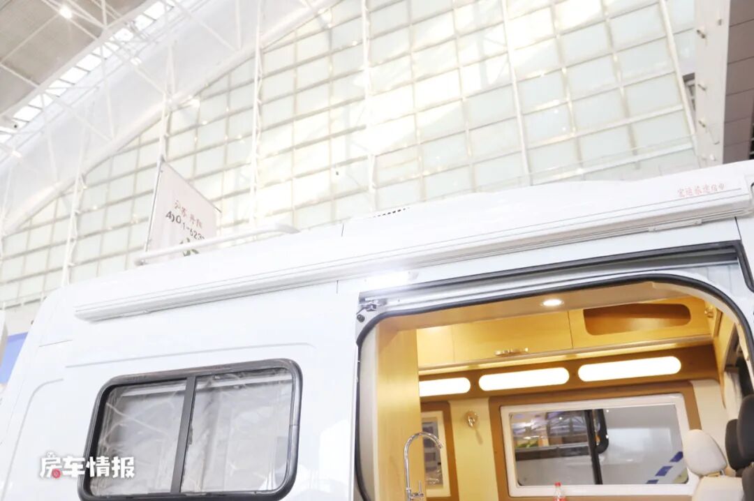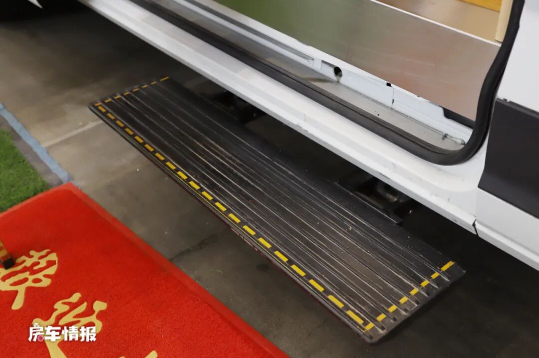车身右侧上方同样提供了一台手动的遮阳棚,下方乘客门处提供了电动踏步,方便上下车,同时车身外部还提供了水电接驳口,方便平时为房车补给。