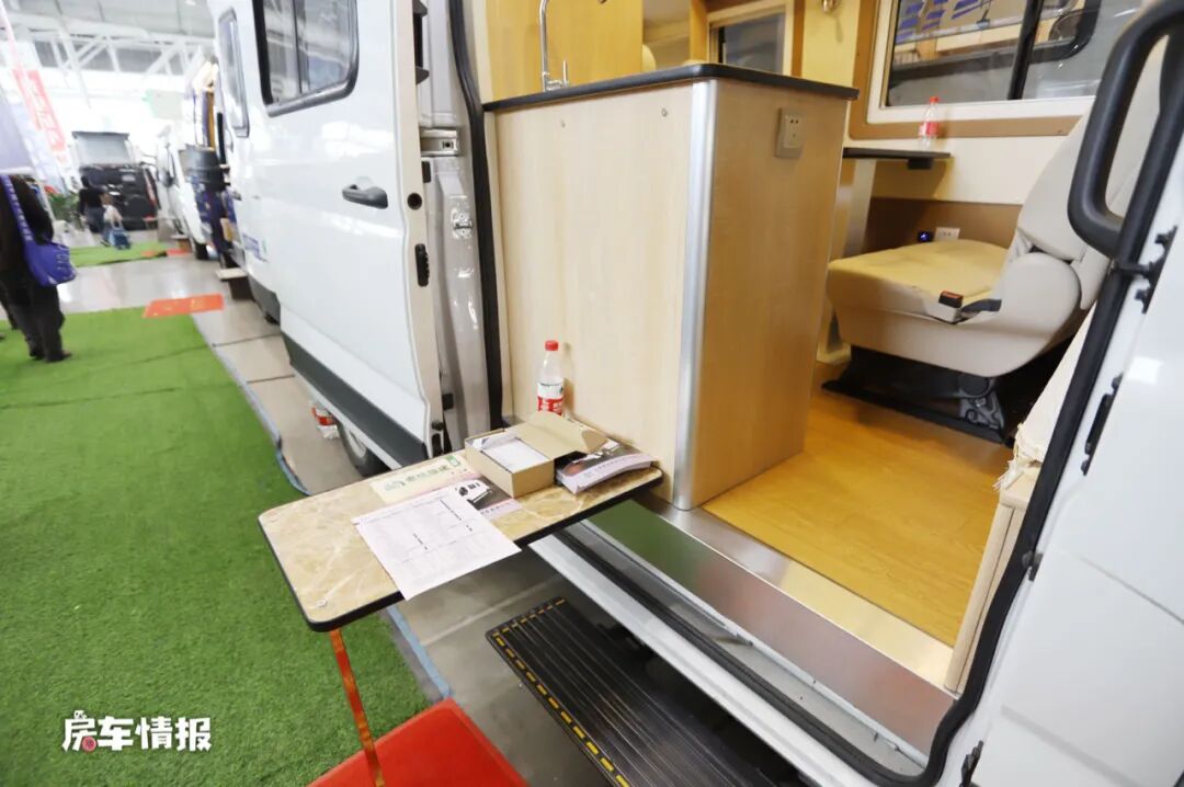 不过这款房车也加入了一个非常人性化的设计,就是提供了一台可移动的小桌板,平时在车外驻车休息时,打开遮阳棚,将小桌板支好,就可以得到一个建议的室外用餐区。
