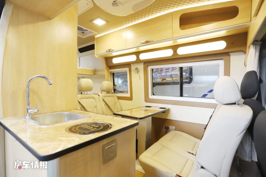 驾驶室延续了原车的设计风格,主驾驶提供多功能方向盘和8向可调节功能,中控台中央也配备了一台彩色显示大屏,便于平时操控。除此之外,这款房车还装载了ABS+EBD+BAS、定速巡航、安全气囊等安全系统设施,近一步提升了整体的安全系数。