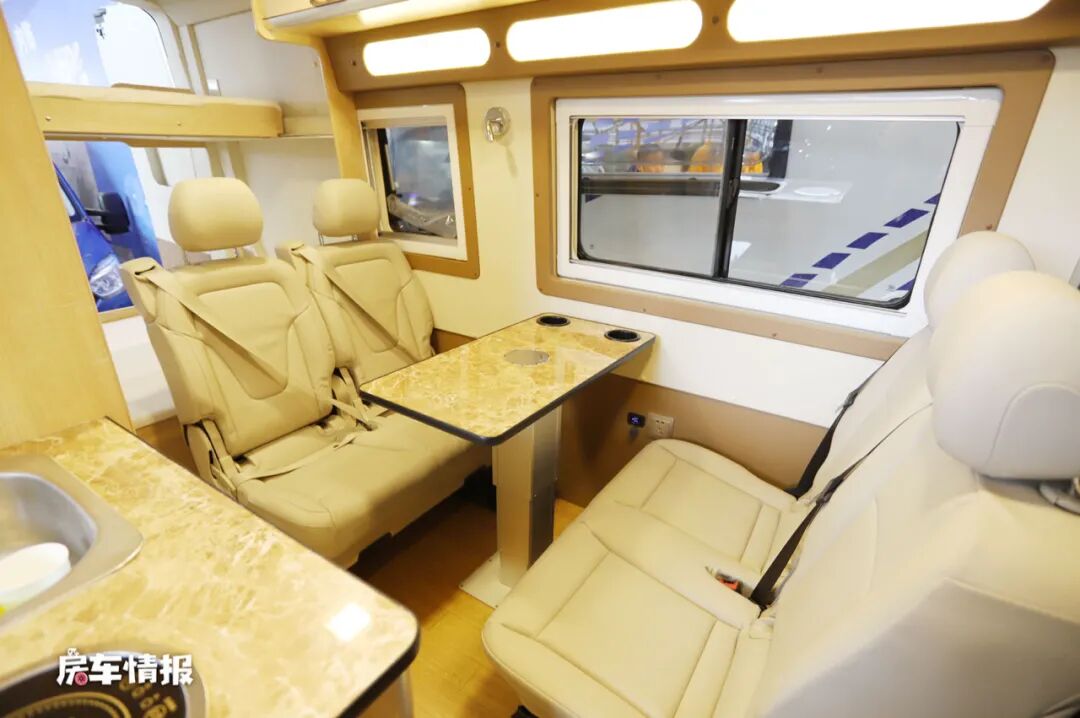与乘客门相对的是整车的会客区,由两排对坐沙发和一张可升降的小号餐桌组成,沙发座椅全部采用皮质软包工艺,不仅看起来非常的豪华,而且乘坐起来也非常的额舒适,四个沙发座椅分别配备了安全带和头枕,平时行车时全车总共可以核载6人,不过相较于如此豪华的沙发座椅,中间的餐桌就稍微有一些“掉价”了。同样会客区的上方提供了多个储物吊柜,方便平时使用。