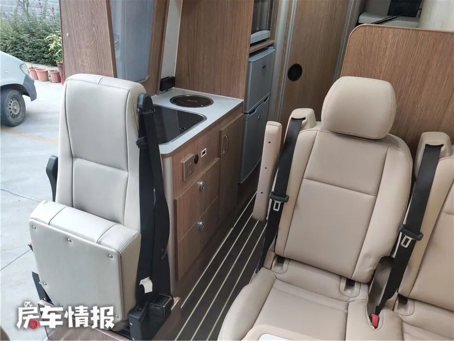 而位于侧滑门旁的单人座椅从折叠式变成了固定式,舒适性得到了大幅度提升,同时单人座椅后方的的厨房区域还增加了一个储物柜,空间更大。
