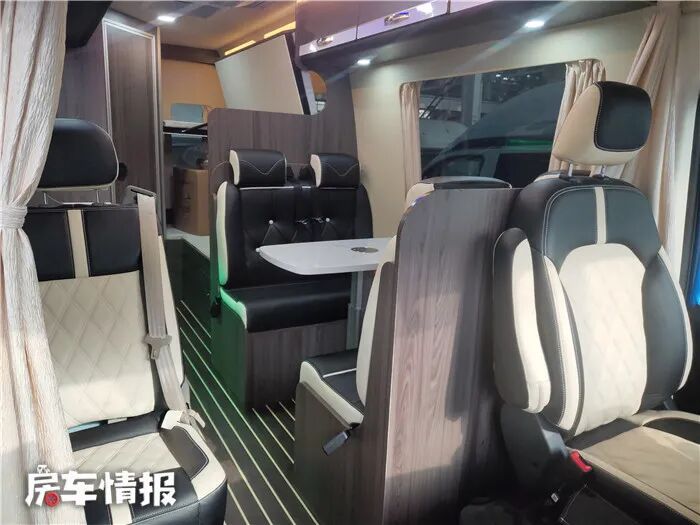 另一种布局是基于长轴加长版底盘打造的,更大的车身就赋予了车内更大的空间,最大的改变在于驾驶室后方的会客休息区,这里采用的是一组四人对坐沙发,这可以是在C型房车上采用使用的设计,由此可见车内空间有多大!