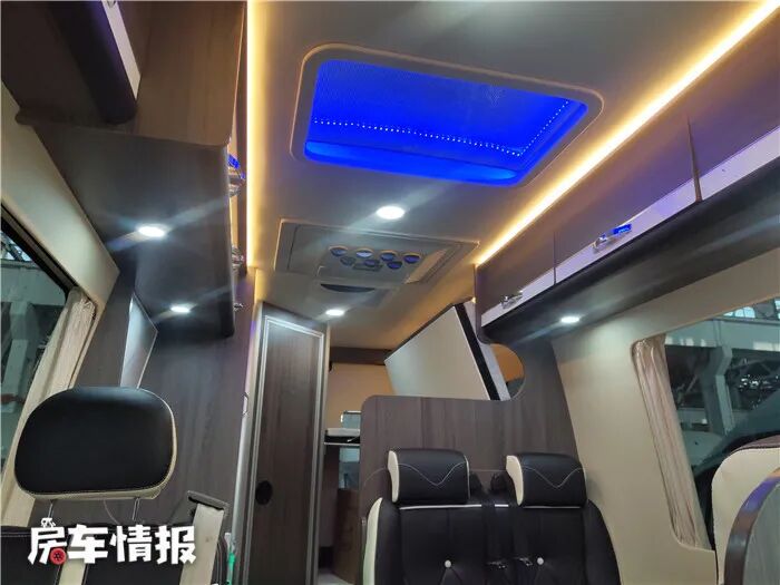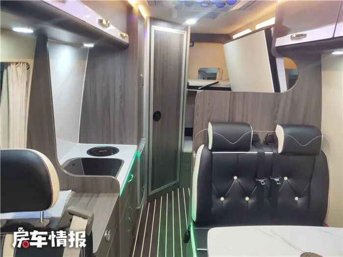 进入车厢内部,车内为消费者提供了两种不同的布局方案,咱们先来看看第一种布局方式,所使用的底盘是长轴标准版底盘,车内的布局相对来说要常见一些,和大通V80、大通V90的B型房车基本相当,空间表现一般。