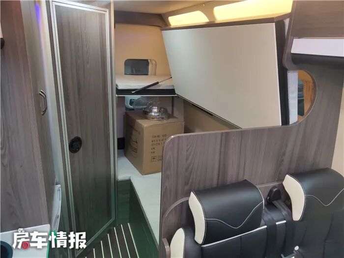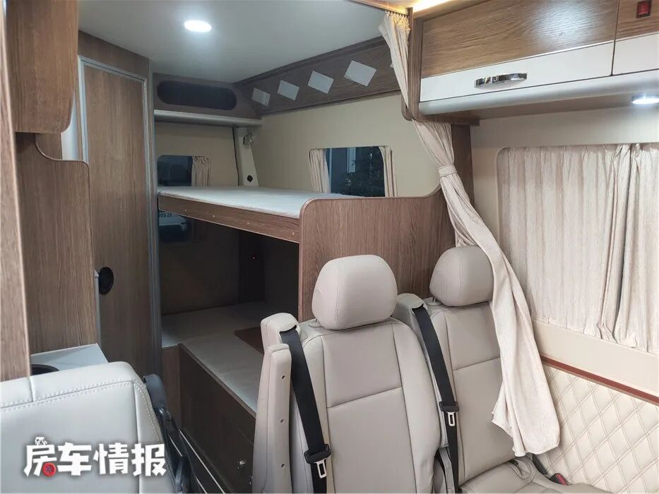 车内的休息区采用的是一组上下双层床位设计,可以满足2名成年人休息,上层床不使用的时候还可以把床板向上掀起,一次来增加下层床的垂直空间。卫生间位于车厢尾部。