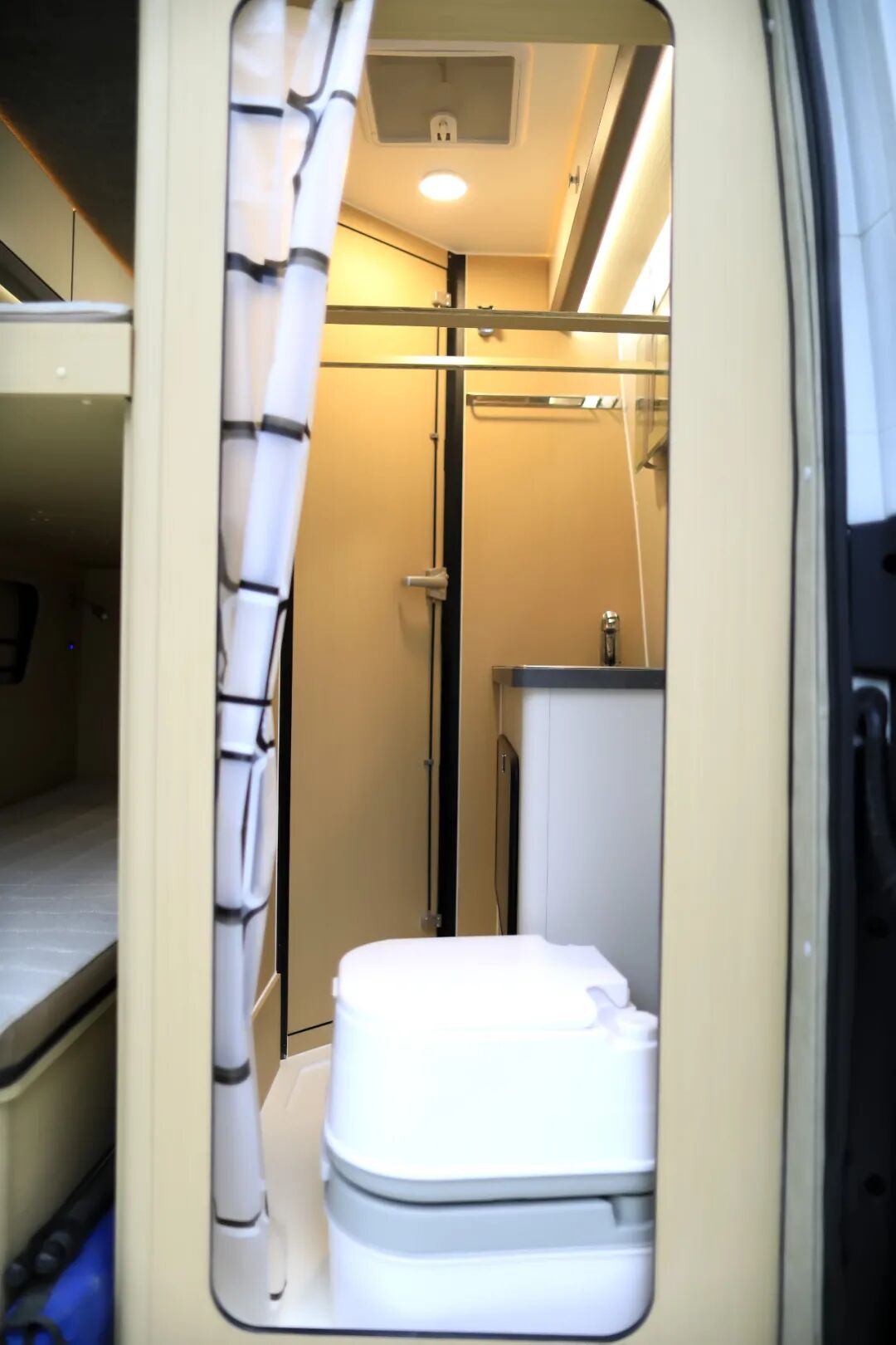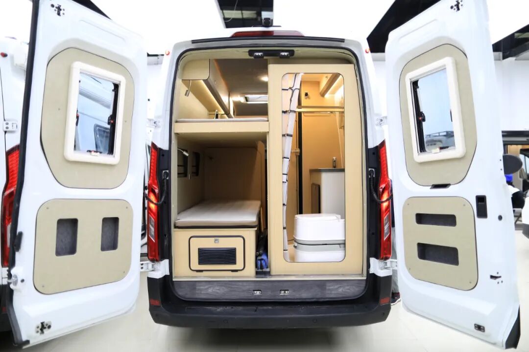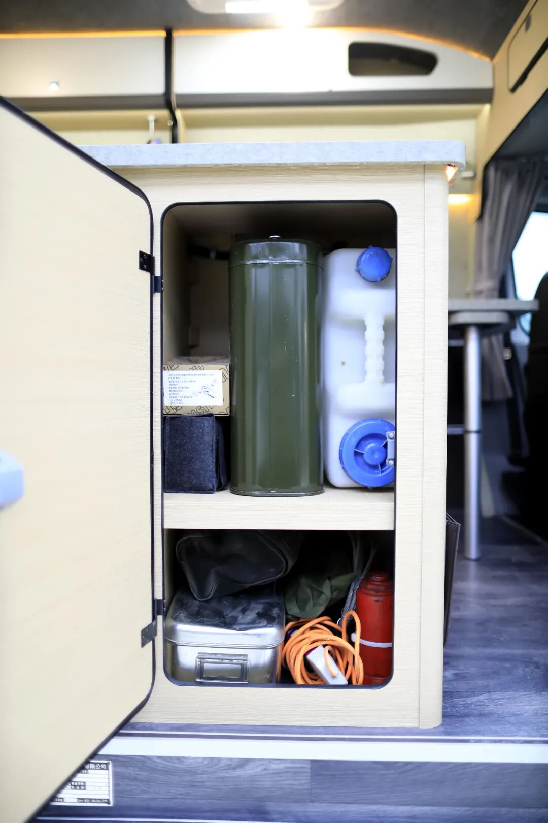 所以他的整车设计,前面完全取消了厨房的部分,把厨卫集中在了后面,并且有一个很巧妙的设计,就是后门没有封闭,一打开就可以通出去。他的房车是在纵床上下铺的基础上进行的改装,并且对这种设计非常满意。