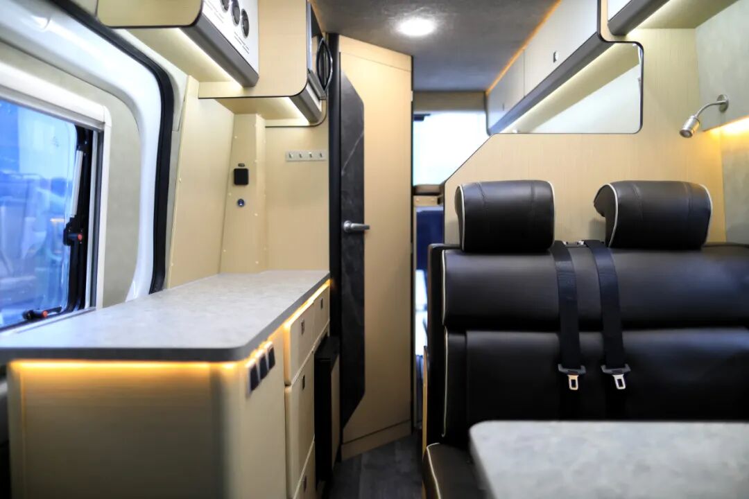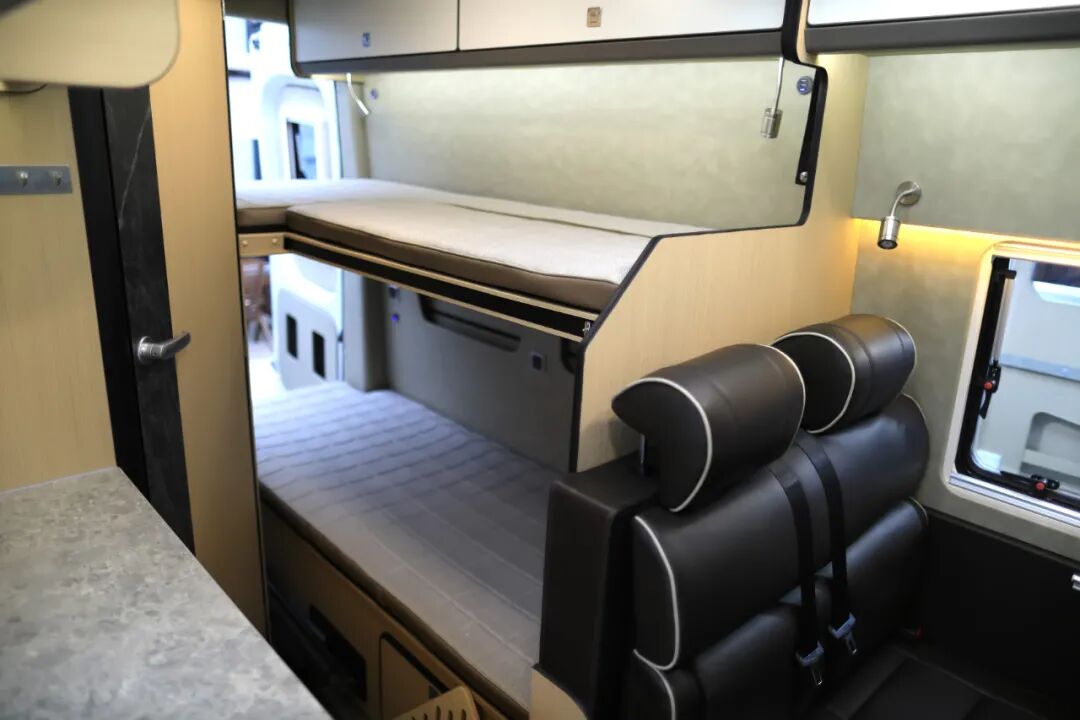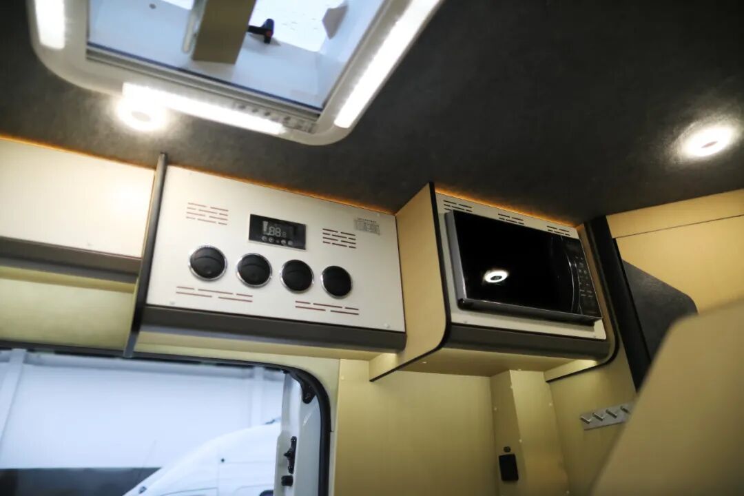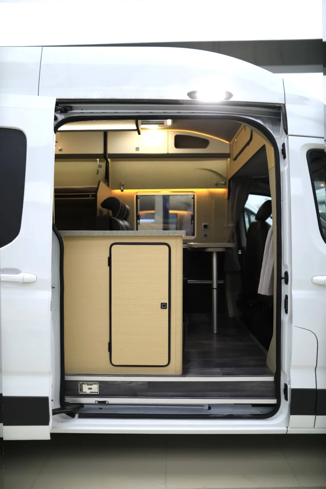 所以他的整车设计,前面完全取消了厨房的部分,把厨卫集中在了后面,并且有一个很巧妙的设计,就是后门没有封闭,一打开就可以通出去。他的房车是在纵床上下铺的基础上进行的改装,并且对这种设计非常满意。