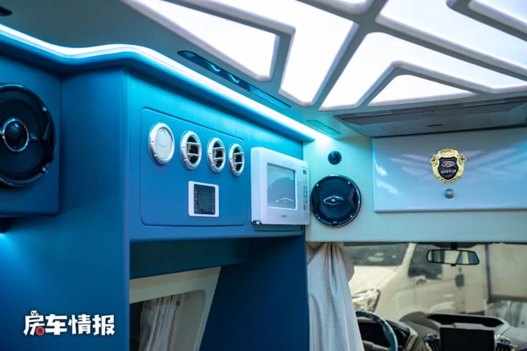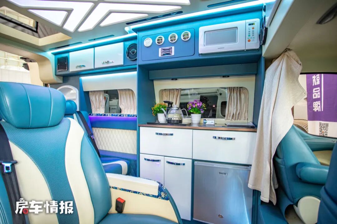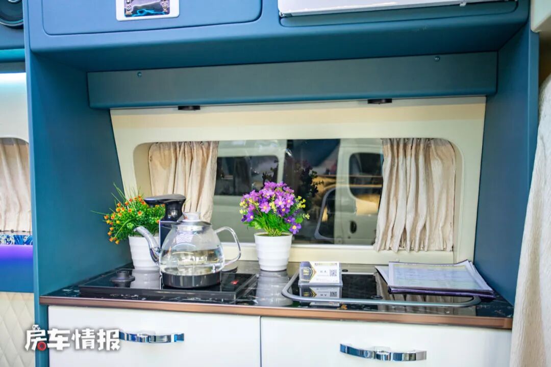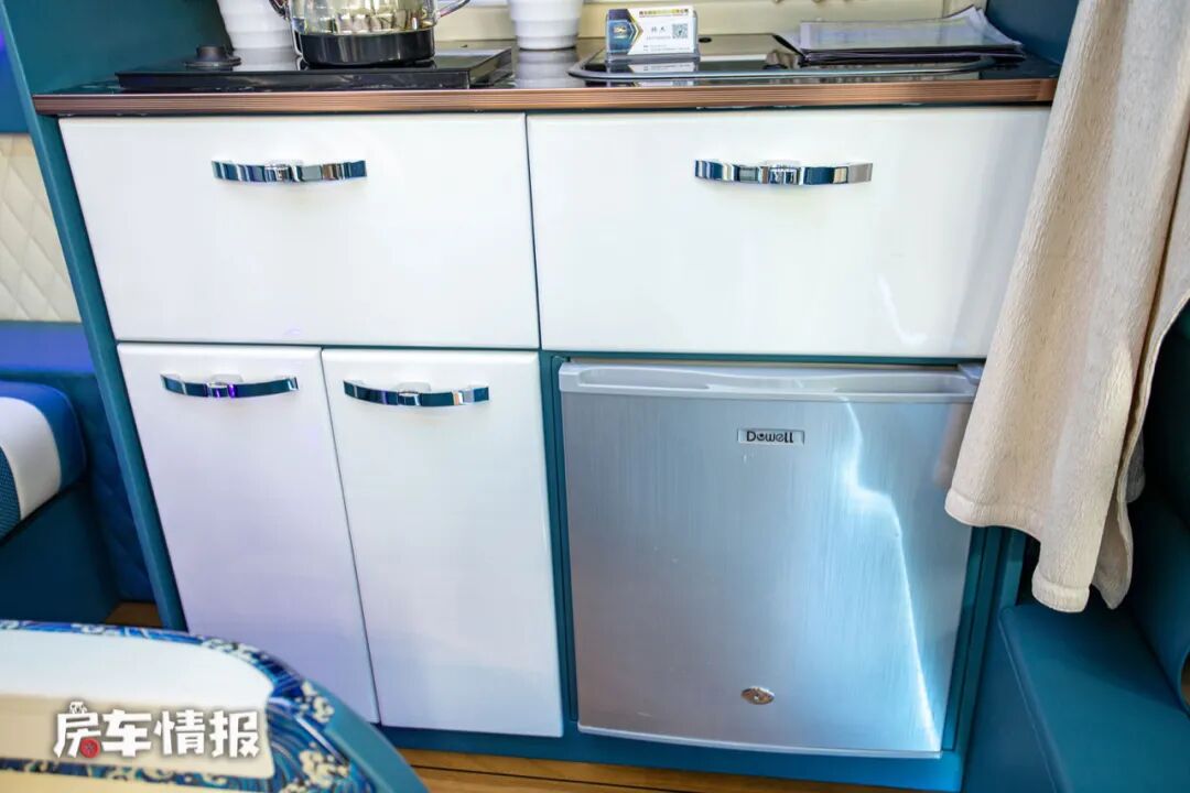乘客门对面的厨房操作台也做了包围处理,台面上提供了电磁炉和水槽,上方配备了一台微波炉,下方则带有储物空间和一台50L的车载冰箱,美中不足的是如果能提供一台抽油烟机,可以改善车内的油烟问题就更好了。
