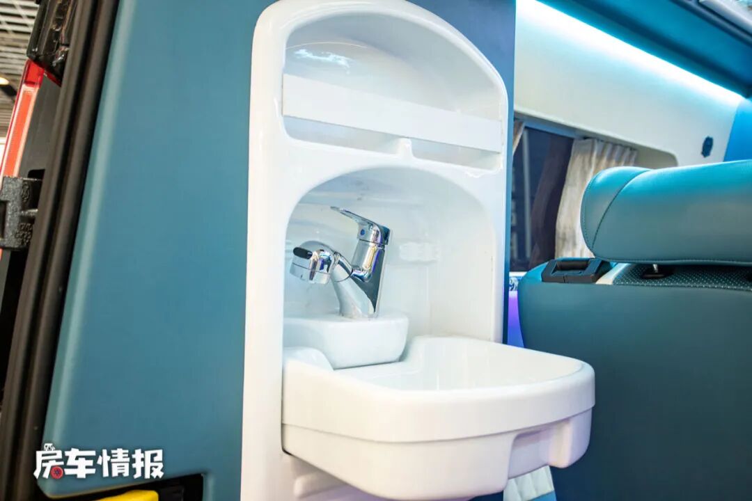 这款房车采用了后置淋浴区的设计,车厢一侧带有折叠洗手台,既实用又节省空间。同时整夜还配备了1.5米长的淋浴花洒,满足平时的洗漱需求。如果后期有需求也可加装一台便携式的马桶。