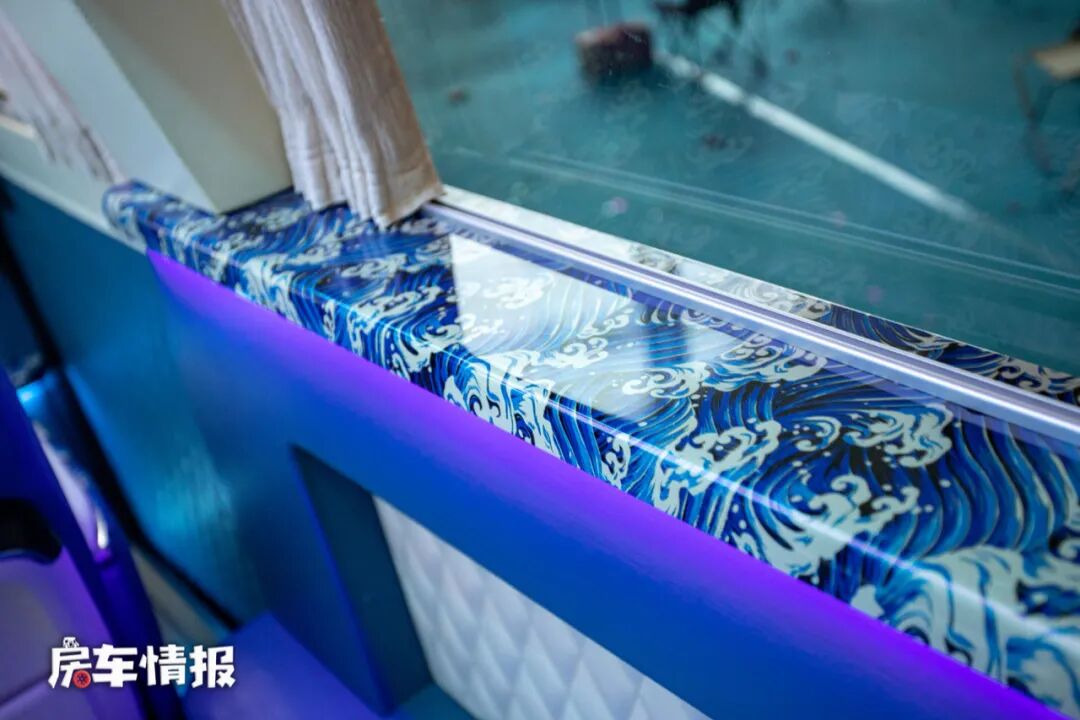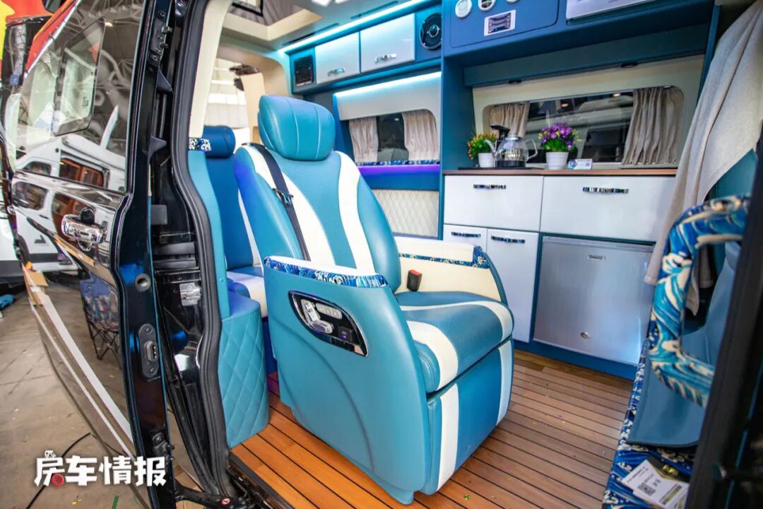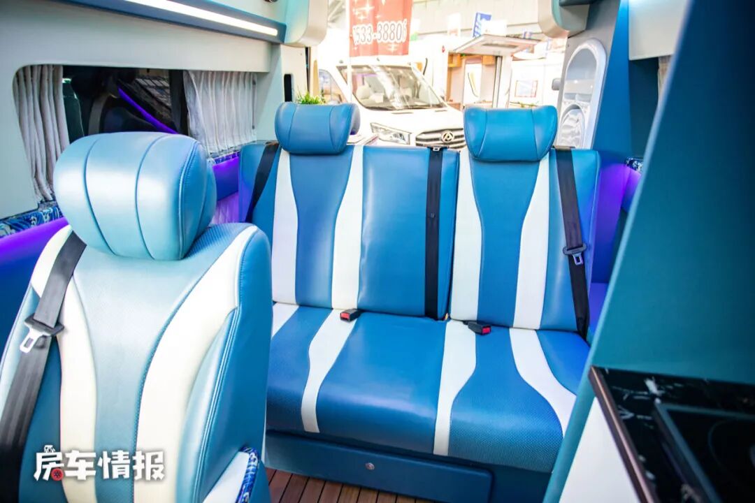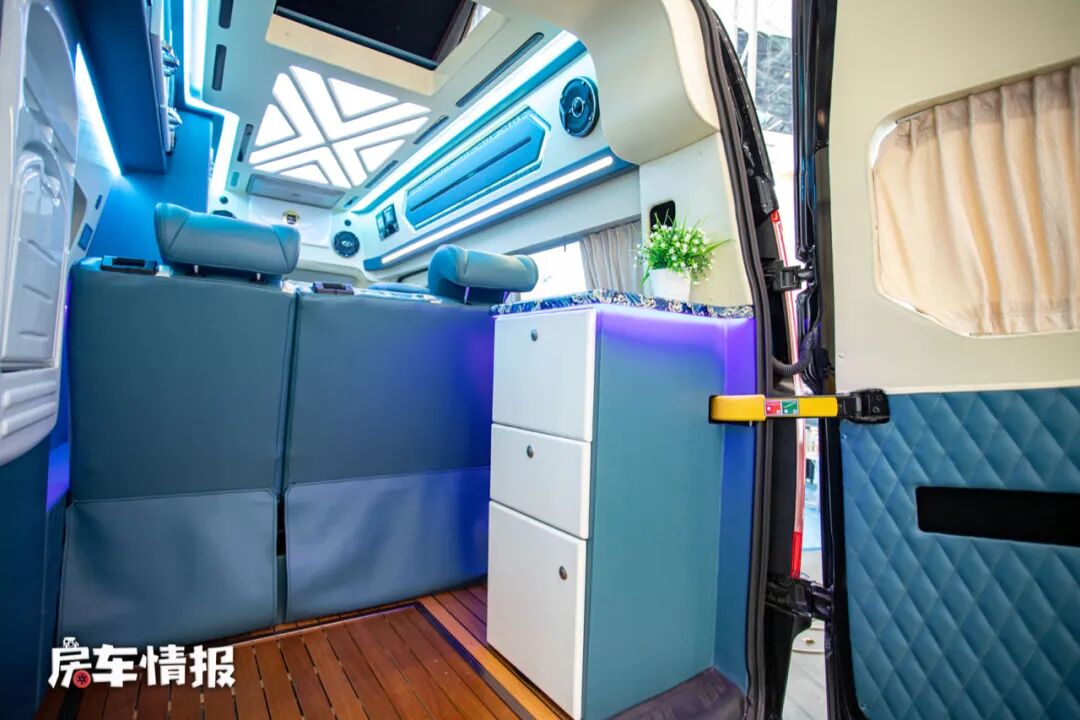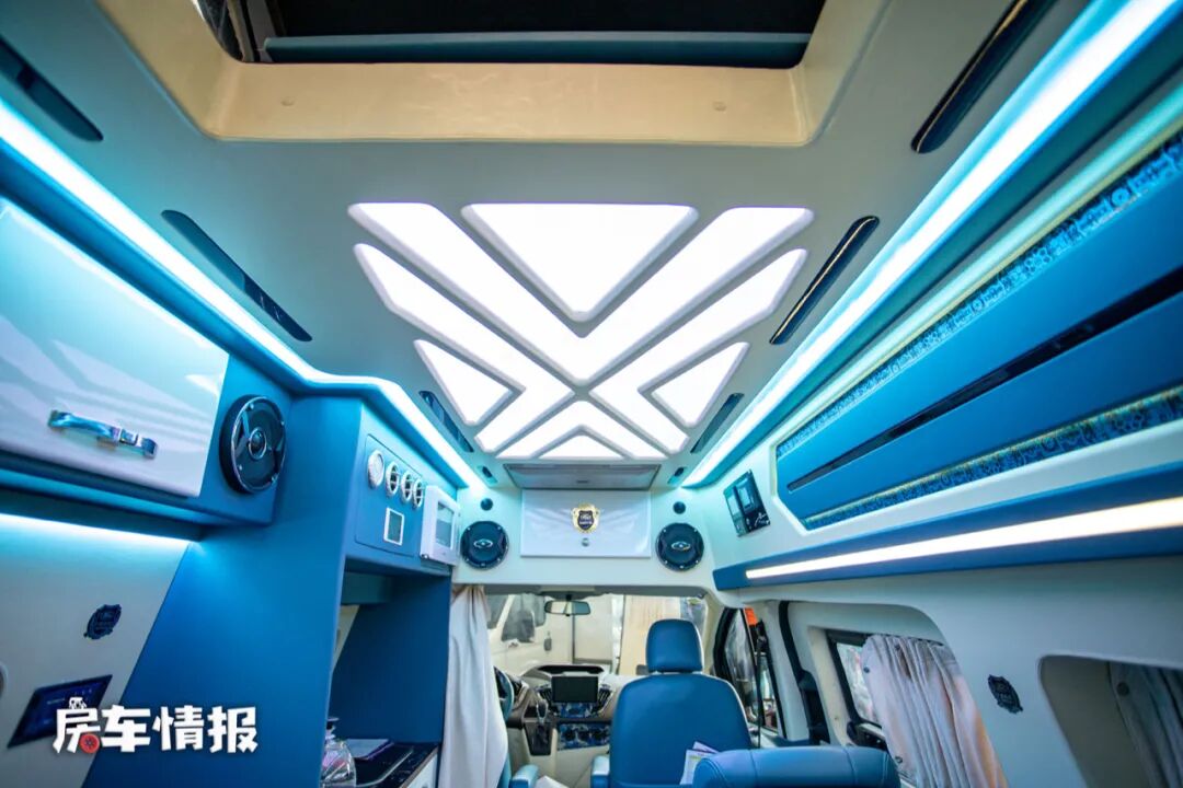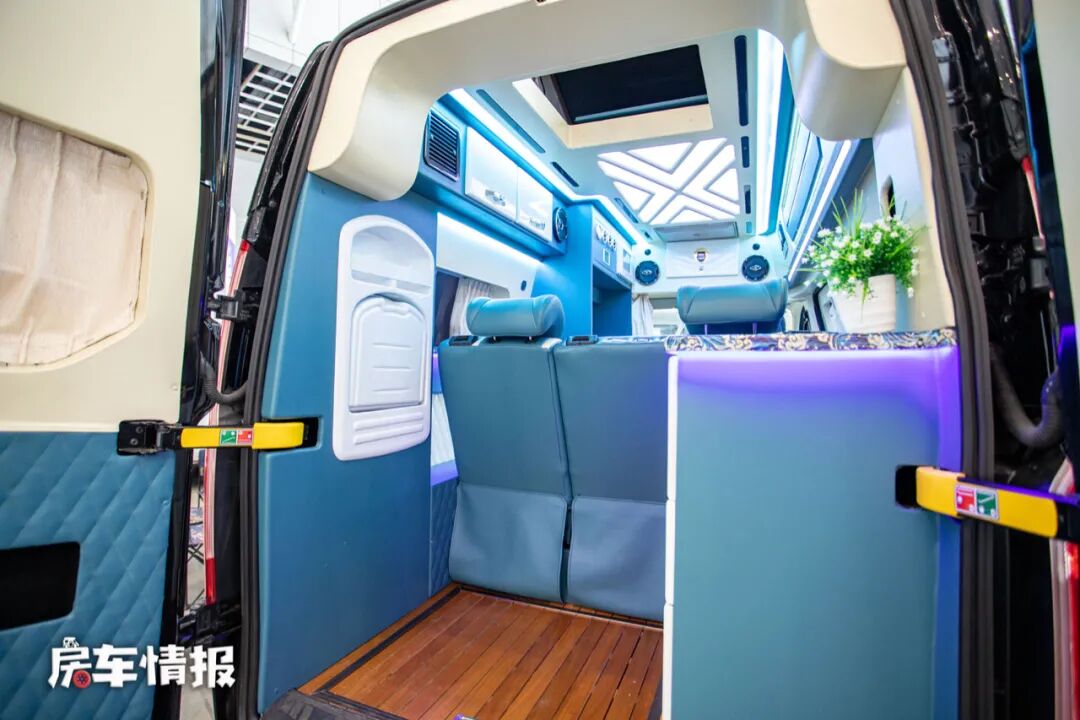从右侧的乘客门进入车厢内部,就像进入了蓝色的海洋,全车都采用了蓝色的内包和实木地板,搭配顶部的大尺寸造型顶灯,整体感觉非常的梦幻。