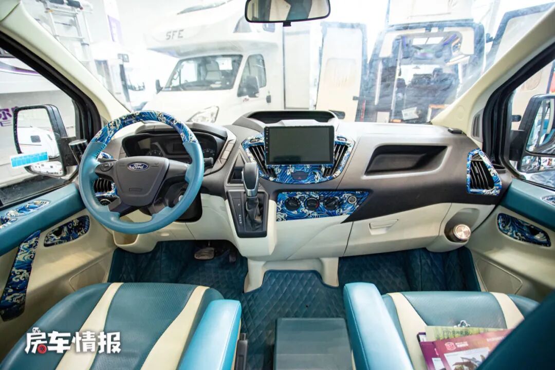 驾驶室设计的非常新潮,主副驾驶座椅都采用超纤皮软包工艺,白蓝相间的配色非常的亮眼。而中控台和方向盘的彩绘图案让整车更加彰显了个性,方向盘也采用了半桃木软包材质,握起来也十分舒适。