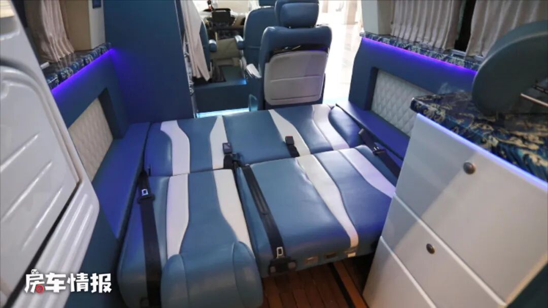后排的三人电动沙发座椅虽然功能不及航座座椅齐全,但是皮质软包的工艺乘坐起来也是十分舒适的,另外晚上需要休息的时候还可以将座椅完全放倒,变成一张1700mm*1200mm的沙发床。