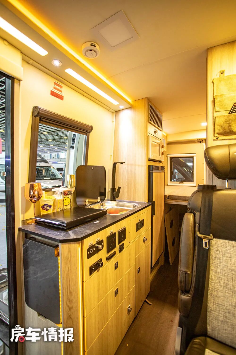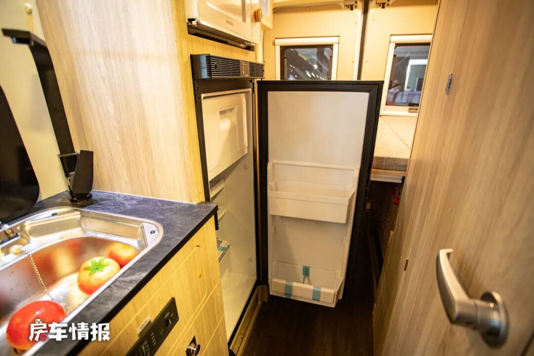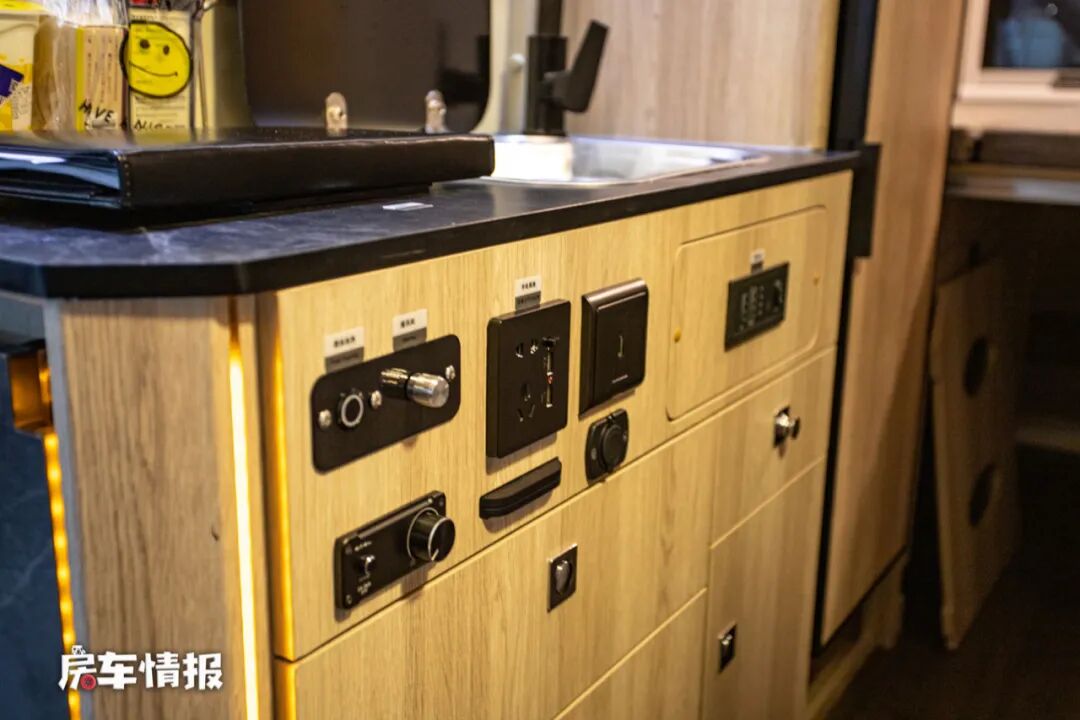 乘客门后方是厨房操作台,台面的面积还不错,提供了一台便携的电磁炉和一个翻盖的不锈钢水槽,橱柜侧面还增加了折叠的小桌板也扩大原始使用面积,台面下方则提供了多个储物空间。