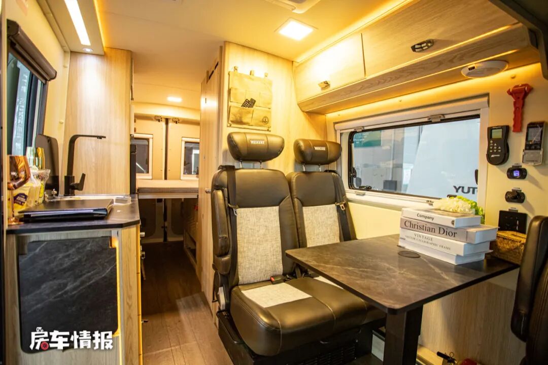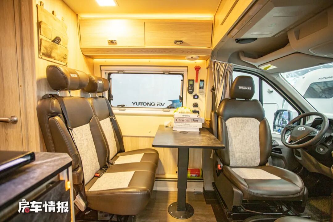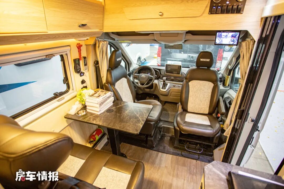 从车身右侧乘客门进入车厢,整体的装潢风格采用的暖色系,搭配原木色的家具,非常的温馨。
