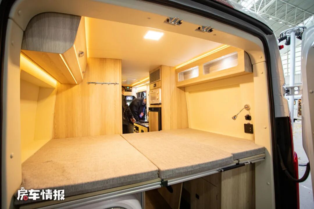 这款房车的休息区是采用了一张横置双人床的设计,尺寸为1850mm*1200mm,平时床板下方也可以放大件行李,不影响床铺的使用,床头床尾上方都提供了储物空间,床头还配置了小夜灯方便平时使用。