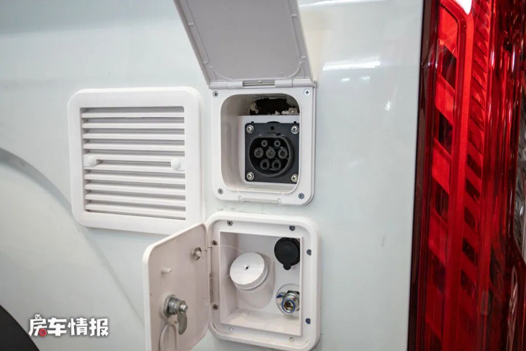 由于B型房车自身的限制,所以车身外部只配备了遮阳棚和基础的水电接驳口,采用新能源车充电口,满足随时为房车进行补给的需求。
