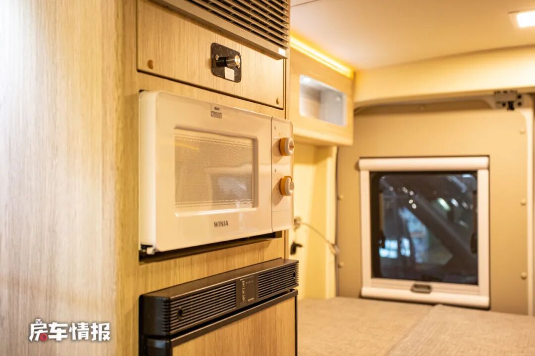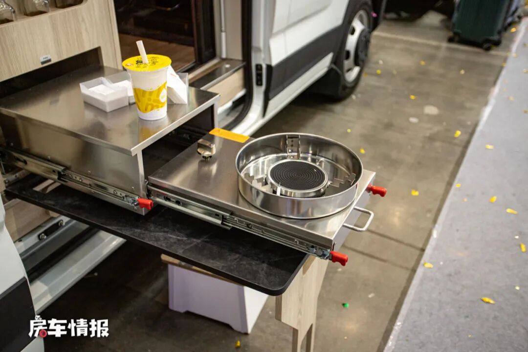 另外在橱柜的背部还隐藏了一台抽拉式的燃气灶,如果担心车内做饭会带来油烟也可以选择在车外进行烹饪。