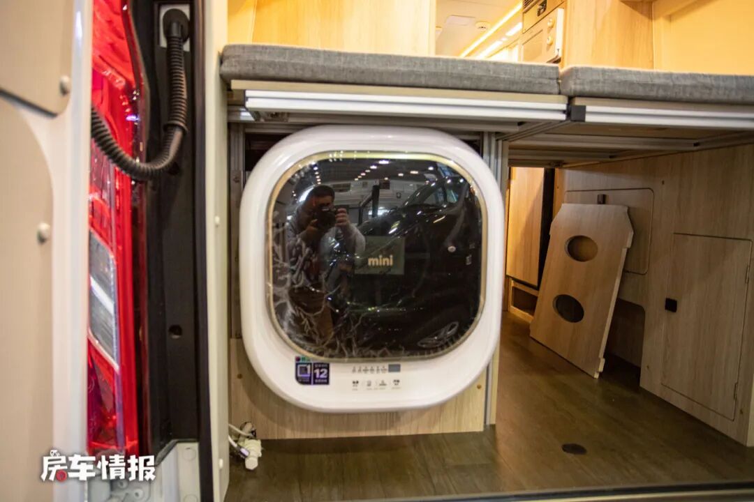 打开后尾门可以看到在尾床的下方还隐藏了一台迷你洗衣机,平时可以洗一些小型衣物,非常人性化和实用。